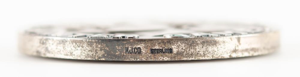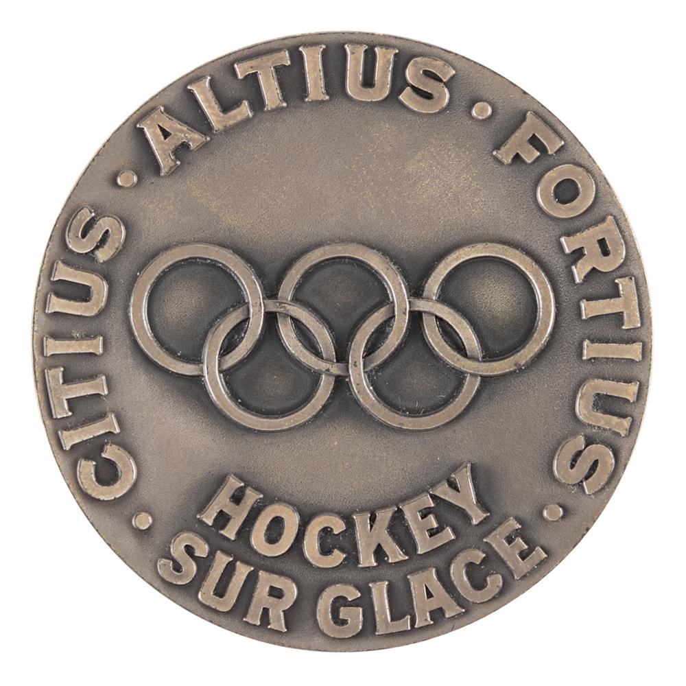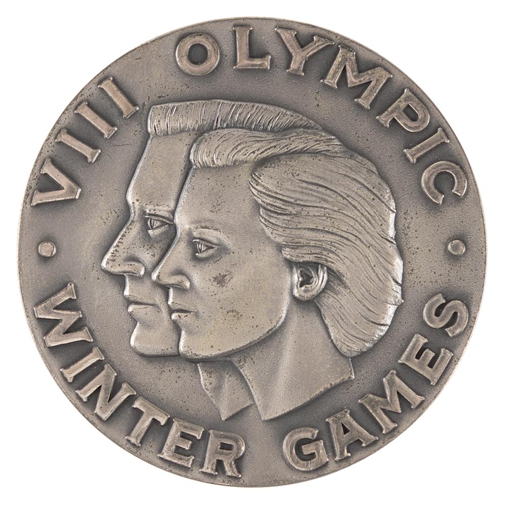 Rare winner’s medal in ice hockey from the Squaw Valley 1960 Winter Olympics. Sterling silver, 55 mm, 104 gm, by Herff Jones, Indiana. The front features the heads of male and female athletes in profile, with bold block-letter text, “VII Olympic, Winter Games”; the reverse features the Olympic rings under Olympic motto of “Citius, Altius, Fortius,” with the sport below: "Hockey Sur Glace." Stamped "H. J. Co." and "Sterling" on the edge. This was the first Winter Olympic medal to feature the name of the sport.
