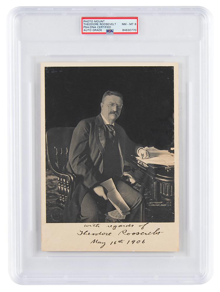 Exceptional matte-finish 6 x 7.5 portrait of Roosevelt in a seated profile pose by the Clinedinst Studio, affixed to the original 6.5. x9 studio mount, which is signed in fountain pen as president, "With regards of Theodore Roosevelt, May 16th 1906." In fine condition, with old adhesive residue on the back. Encapsulated and graded by PSA/DNA as "NM-MT 8."
