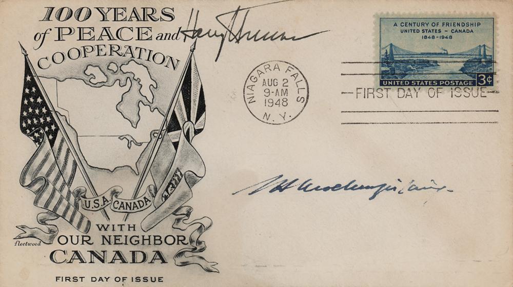 FDC with a cachet honoring 100 years of peace and cooperation between U.S.A and Canada, postmarked at Niagara Falls on August 2, 1948, signed in fountain pen by Harry S. Truman and William Lyon Mackenzie King. In fine condition.