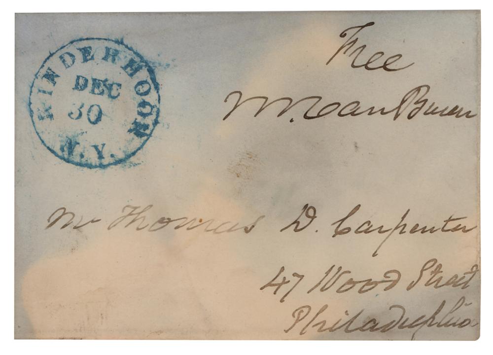 Hand-addressed and free franked mailing panel, 4.25 x 3, addressed by Martin Van Buren to "Mr. Thomas D. Carpenter, 47 Wood Street, Philadelphia," and franked in the upper right, "Free, M. Van Buren." Postmarked at Kinderhook, NY, December 30, [no year]. In very good to fine condition, with closely trimmed edges and overall staining.