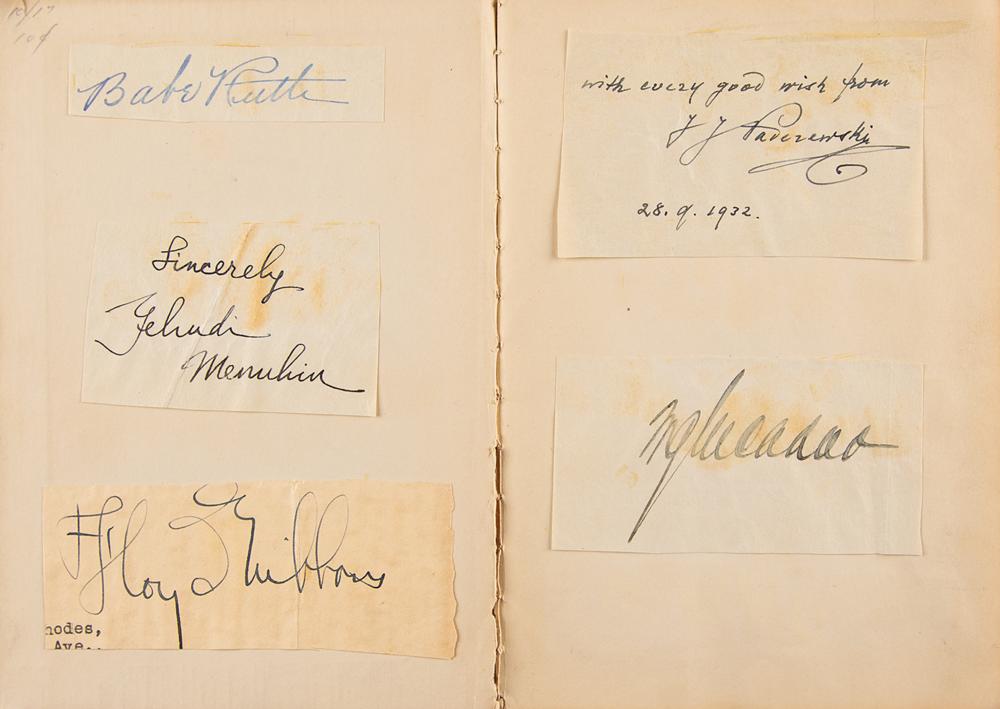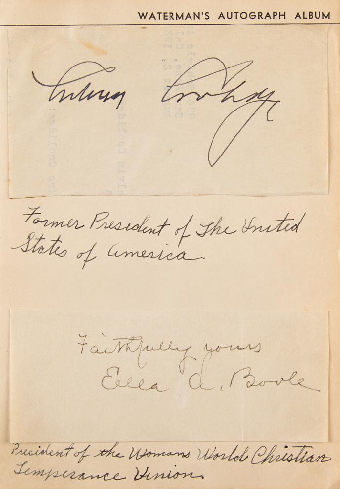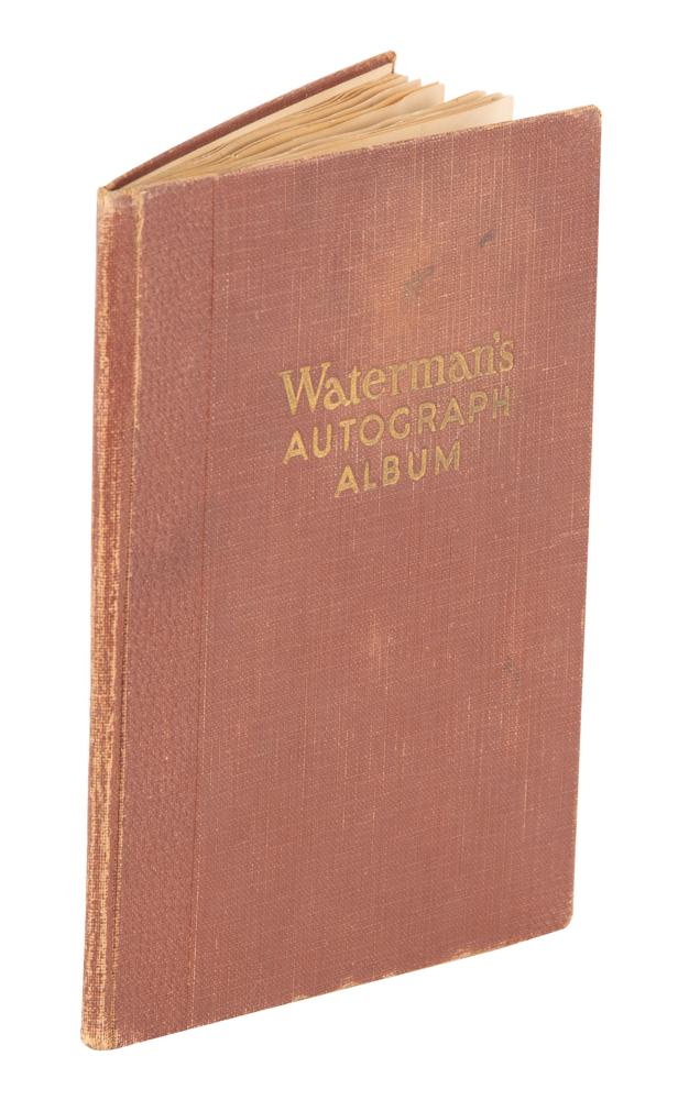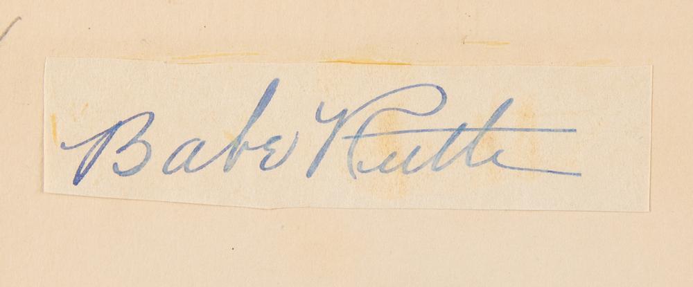 Vintage fountain pen signature, "Babe Ruth,” on an off-white 3 x .75 slip affixed inside the front cover of a circa 1932 Waterman's Autograph Album. Other signatures within the album (mostly clipped and affixed inside) include: Calvin Coolidge, Ignacy Jan Paderewski, Charles H. Mayo, William J. Mayo, Glenn S. 'Pop' Warner, Yehudi Menuhin, Floyd Gibbons, William Gibbs McAdoo, Ella A. Boole, Perry Newberry, John Nance Garner, Al Smith, Aimee McPherson, Rudy Vallée, and Mary Pickford. Most other signatures are of minor local figures and lesser-known politicians, such as governors, mayors, and police chiefs. In fine condition, with some show-through from adhesive.