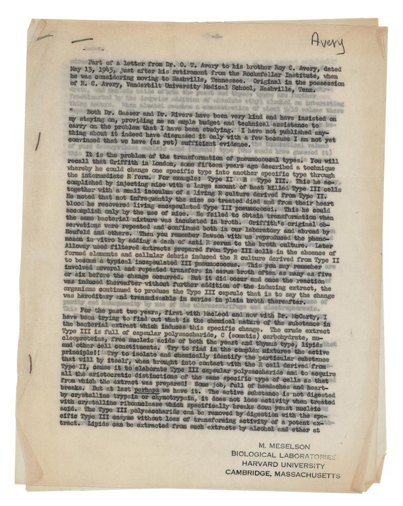 Typewritten carbon copy excerpt of a letter, three pages, 8.5 x 11, May 13, 1945. Headed: "Part of a letter from Dr. O. T. Avery to his brother Roy C. Avery, dated May 13, 1943, just after his retirement from the Rockefeller Institute, when he was considering moving to Nashville, Tennessee. Original in the possession of R. C. Avery, Vanderbilt University Medical School, Nashville, Tenn." The text concerns Avery's work on pneumococci and its amazing implications—his determination that the substance in cells containing the hereditary material was DNA and not proteins, as most biochemists had assumed in the past. In part: "If we are right, & of course that's not yet proven, then it means that nucleic acids are not merely structurally important but functionally active substances in determining the biochemical activities and specific characteristics of cells & that by means of a known chemical substance it is possible to induce predictable and hereditary changes in cells. This is something that has long been the dream of geneticists?Sounds like a virus—maybe a gene. But with mechanisms I am not now concerned—one step at a time?Of course the problem bristles with implications?It touches genetics, enzyme chemistry, cell metabolism & carbohydrate synthesis—etc. But today it takes a lot of well documented evidence to convince anyone that the sodium salt of deoxyribose nucleic acid, protein free, could possibly be endowed with such biologically active & specific properties & that evidence we are now trying to get. It's lots of fun to blow bubbles, but it's wiser to prick them yourself before someone else tries to."