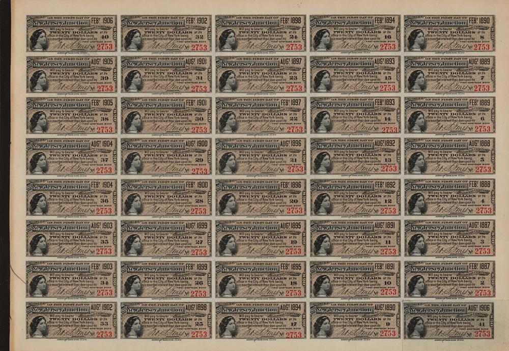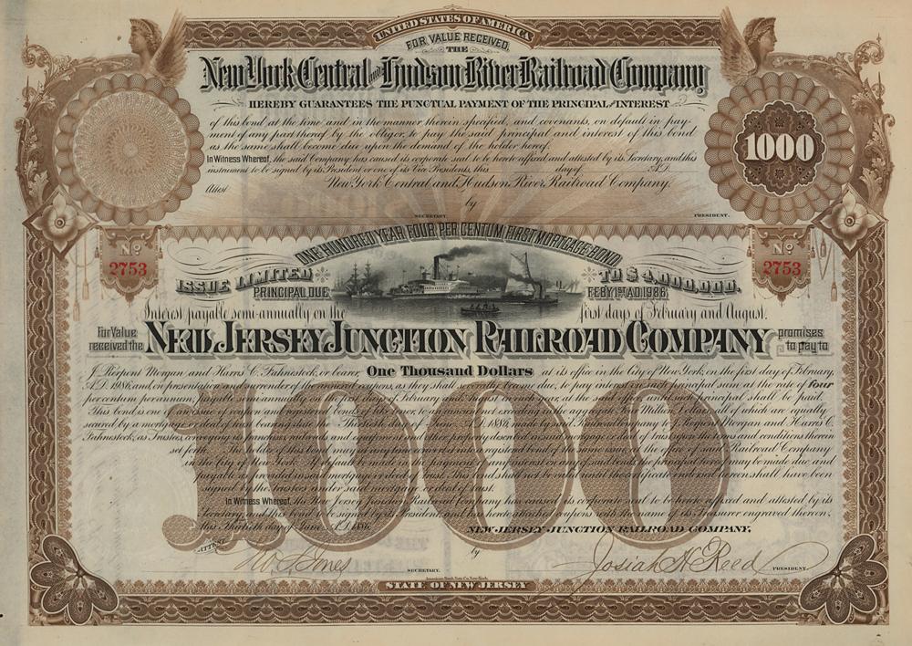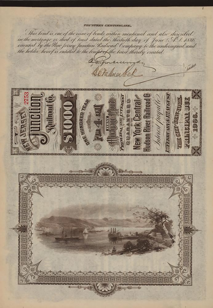 Partly-printed DS, signed “J. Pierpont Morgan,” one page, 13.5 x 9.5, June 30, 1886. First mortgage bond of the New Jersey Junction Railroad Company in the amount of $1000, endorsed on the reverse by J. P. Morgan and H. C. Fahnestock as trustees. Unaccomplished and bound at the left edge with five pages of the original coupons, with 199 of 200 still present. In fine condition.