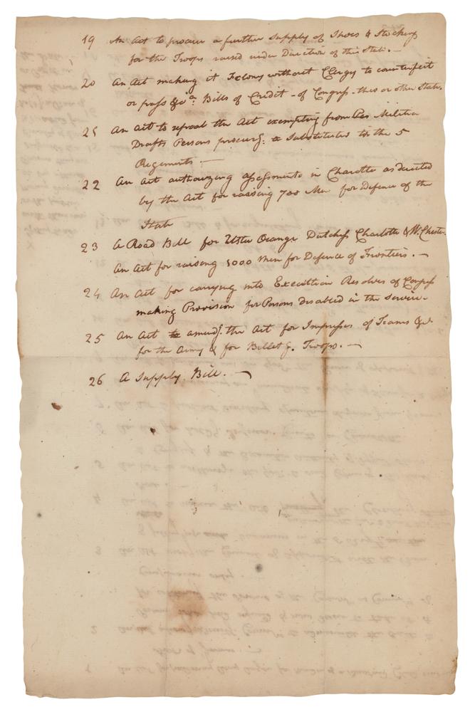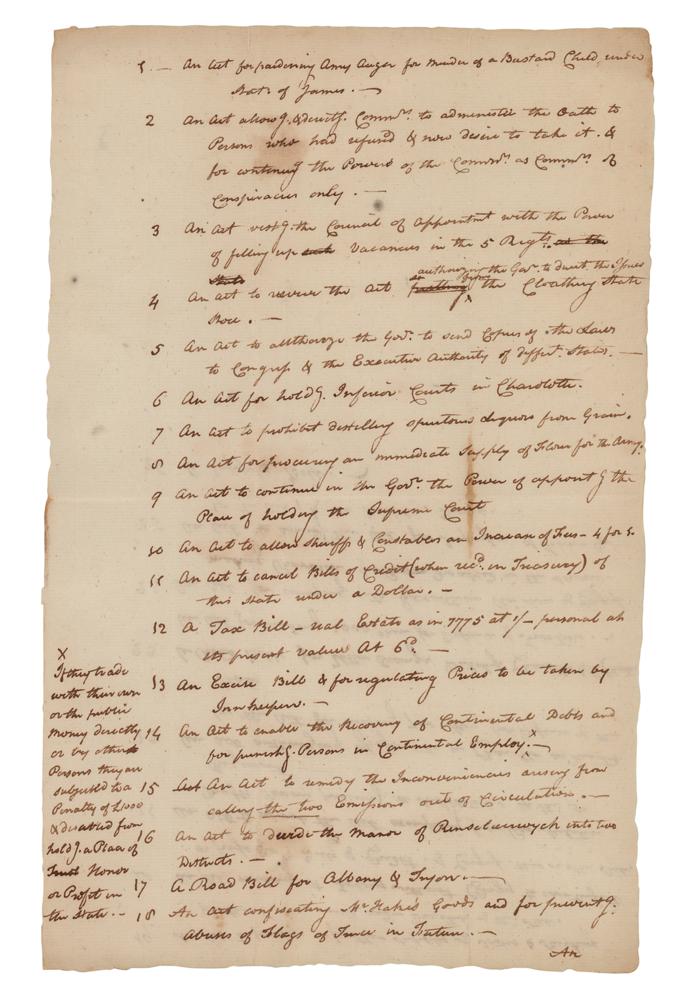 Unsigned Revolutionary War-era handwritten manuscript by John Jay, one page both sides, 8.25 x 13, no date but likely circa 1779. Handwritten manuscript, undoubtedly written by Jay in his capacity as Chief Justice of the New York Supreme Court, listing twenty-six acts, paraphrasing those passed in the second session of the New York State Legislature in 1778-1779. The acts cover a range of matters, many having to do with the ongoing Revolutionary War. They include the pardon of Amy Auger for murdering her bastard child; administration of the oath for continuing the powers of commissioners of conspiracies; prohibition of distillery operations from grain; procuring flour supplies for the army; cancelation of bills of credit under a dollar; regulation of prices by innkeepers; recovery of Continental debts; roads for Albany, Tryon, Ulster, and other New York towns; the prevention of abuses of flags of truce; raising 5000 men for frontier defense; provisions for persons disabled in the service; and other administrative details. In fine condition. Jay may have penned this document for his own use as Chief Justice of New York and a member of the Council of Revision, which had the power to review all acts passed by the legislature for approval or rejection. An interesting legislative manuscript by the future first Chief Justice of the United States Supreme Court.