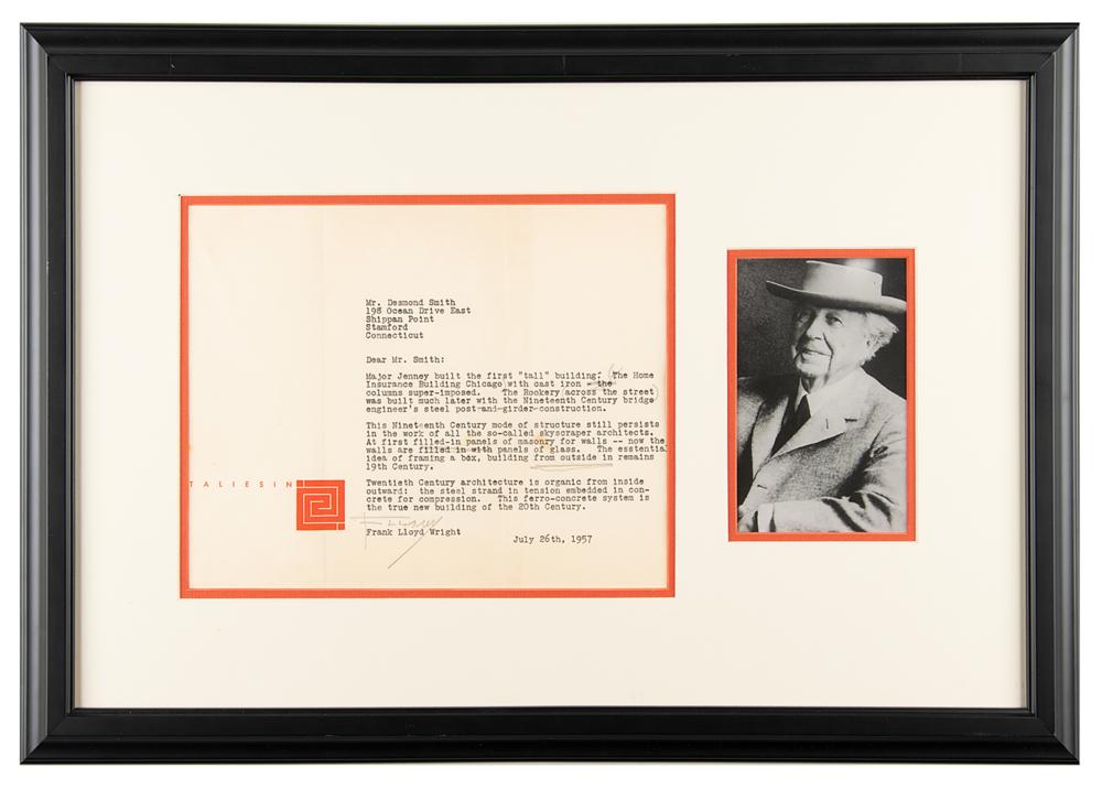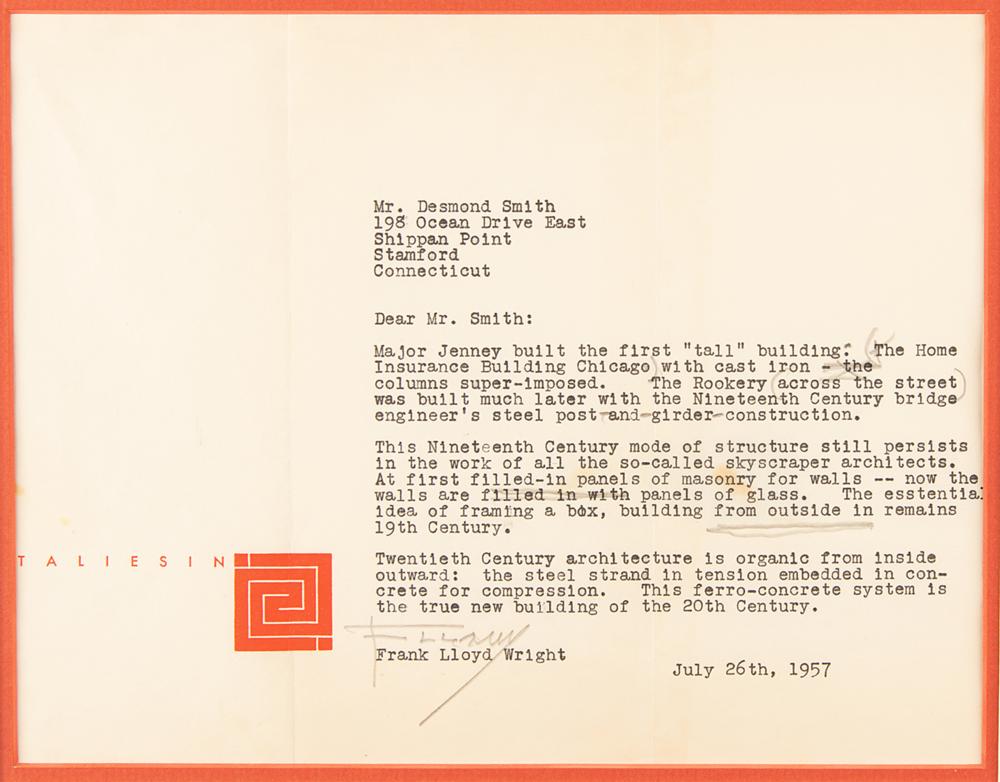 TLS signed “FLLW,” one page, 10 x 7.75, Taliesin letterhead, July 26, 1957. Letter to Desmond Smith, hand-annotated with some punctuation and a few words struck through or underlined. In full: "Major Jenney built the first 'tall' building. (The Home Insurance Building Chicago) with cast iron columns super-imposed. The Rookery (across the street) was built much later with the Nineteenth Century bridge engineer's steel post-and-girder-construction. This Nineteenth Century mode of structure still persists in the work of all the so-called skyscraper architects. At first filled-in panels of masonry for walls—now the walls are panels of glass. The essential idea of framing a box, building from outside in remains 19th Century. Twentieth Century architecture is organic from inside outward: the steel strand in tension embedded in concrete for compression. This ferro-concrete system is the true new building of the 20th Century." Handsomely double-matted and framed with a portrait to an overall size of 22.5 x 15. In fine condition, with creasing in the top blank area.