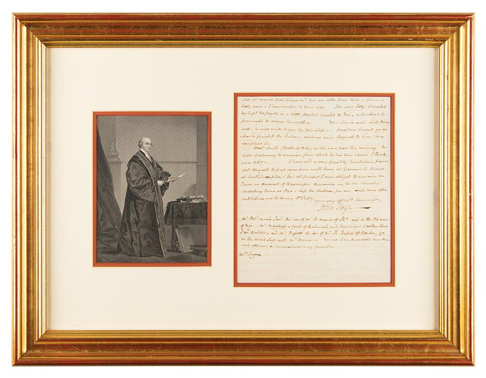ALS, one page both sides, 7.25 x 8.75, September 13, 1794. Handwritten letter from London to his wife Sally, discussing family matters and inquiring about his unfinished portrait by Gilbert Stuart. In part: "I am happy in being assured by your Letter that you and the children were well—God grant that you may all continue so. I am glad that William and his sisters have passed some time at Rye—a run in the country is favourable to Health?Several letters from me to you are now on the ocean—I have not omitted any opportunity of writing that has come to my knowledge. It gives me pleasure that the mill is going on; and I think with Johnny Lyon that it will be profitable unless the expence of it should exceed my expectations?Until the major marries, I fear his attention to the farm will not be sufficiently uniform and minute?Your son is well, and doing well—he will write to you by this ship. How does Stewart go on—has he finished the Picture—continue your request to him to compleat it." He adds a handwritten postscript, in part: "Mr. Rob't Morris Jun'r the son of Mr. R. Morris of Pha. will be the Bearer of this. Mr. Marshall a gent: of Richmond?and Mr. Russell?go on the same ship with Mr. Morris." Handsomely double-matted and framed with an engraved portrait to an overall size of 21.5 x 16.5; there is a window in the backing for viewing the front of the letter. In fine condition.