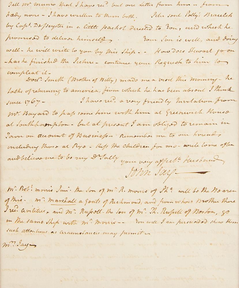 With an urgent need for a peaceful and functional economic relationship with Britain, President Washington sent John Jay to London in the summer of 1794 in hopes of resolving several ongoing, post-Revolution military and commercial disputes. After drawn-out negotiations, the two nations reached an agreement on November 19th, defining terms that would expel royal troops from America’s western frontiers, send the issue of Britain’s debts to arbitration, and grant US ships access to trade routes in and around English ports. In this interesting letter, he mentions an unfinished painting by "Stewart"—presumably the portrait that Gilbert Stuart had left unfinished in 1784. Another famed artist of the era, John Trumbull, accompanied Jay to London as his secretary; Trumbull would complete the portrait upon returning home to America in 1804. Today it resides in the Smithsonian Institution's National Portrait Gallery.