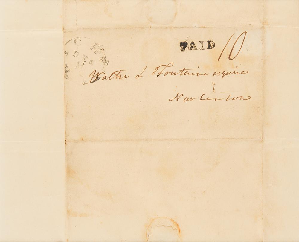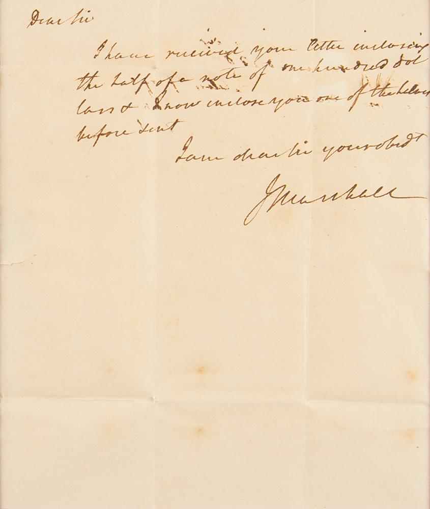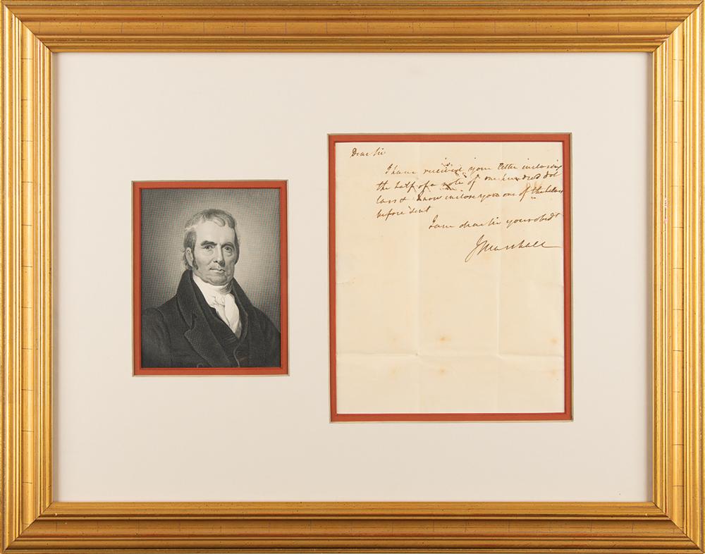 Uncommon ALS signed “J. Marshall,” one page, 6 x 7.25, no date. Handwritten letter to Walter L. Fontaine, in full: "I have received your letter inclosing the half of a note of one hundred dollars and I now inclose one of the halves before sent." Double-matted and framed to an overall size of 19 x 15; there is a window in the backing for viewing the address panel. In fine condition, with some spots of foxing, and a short seal-related tear to the left edge. In 1816, while serving as Chief Justice of the United States Supreme Court, John Marshall sold 421 acres of land to Walter L. Fontaine for $4,215, with a schedule of payments covering 1817 to 1835. This letter may relate to that transaction.