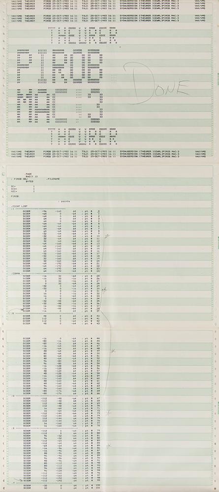 - An early programmer model and speed estimates packet, containing hand-annotated documents for a “Screen Clipping (post project 2-d clipping),” projected full-speed timing, polygon drawing examples and vectors data types, proposed 20 Hz update rate for easy programmer control “Condo Machine control” and pipeline control timing, and “Detail of Communication Ram Data Format”