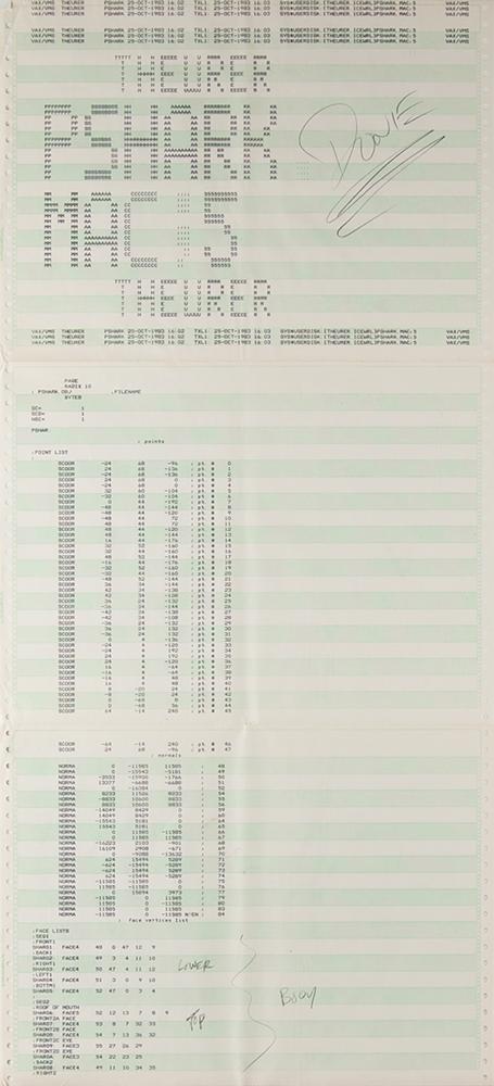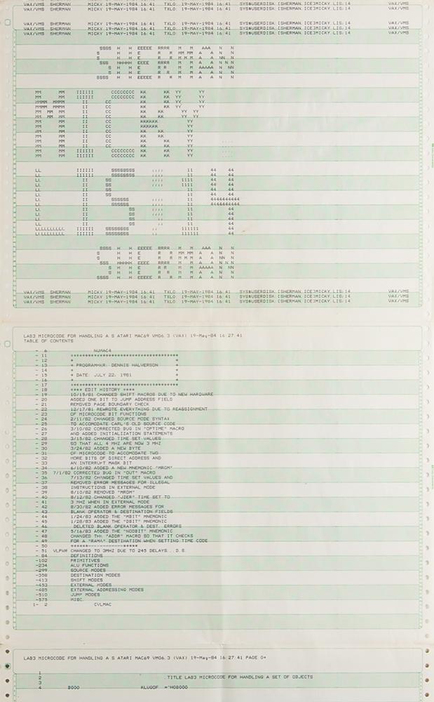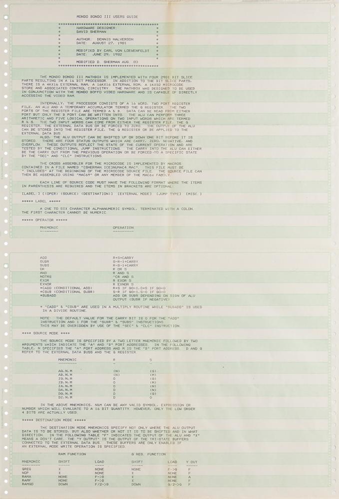 - A very rare computer printout of the “Mondo Bondo Users Guide,” which was coded by Dennis Halverson to Sherman’s specification to create 3-D processor microcode binary; this is the final version of the user guide that Sherman touched for minor speed upgrades and field shuffling