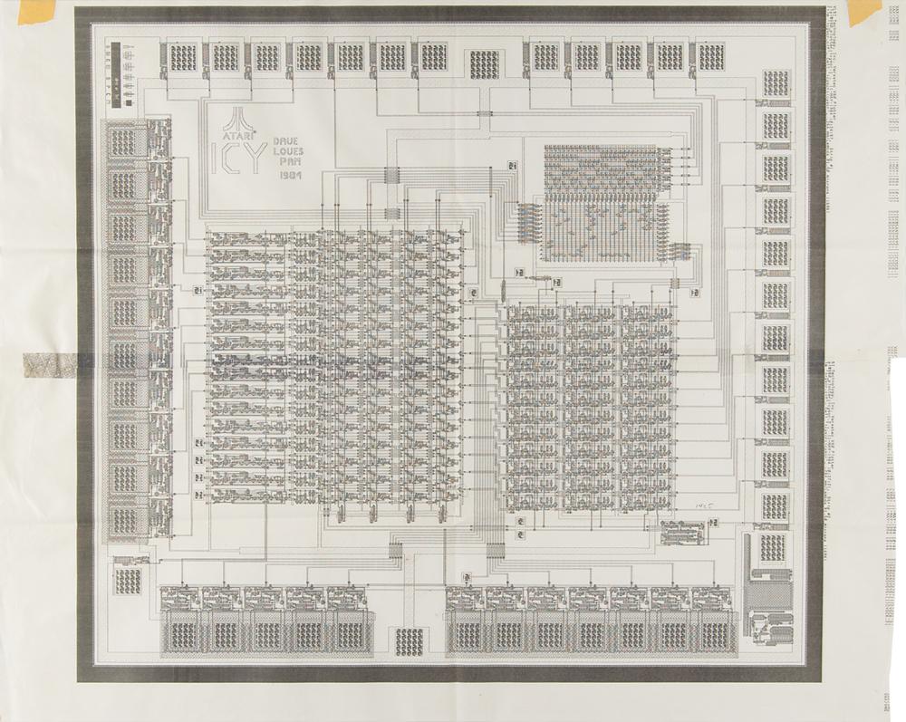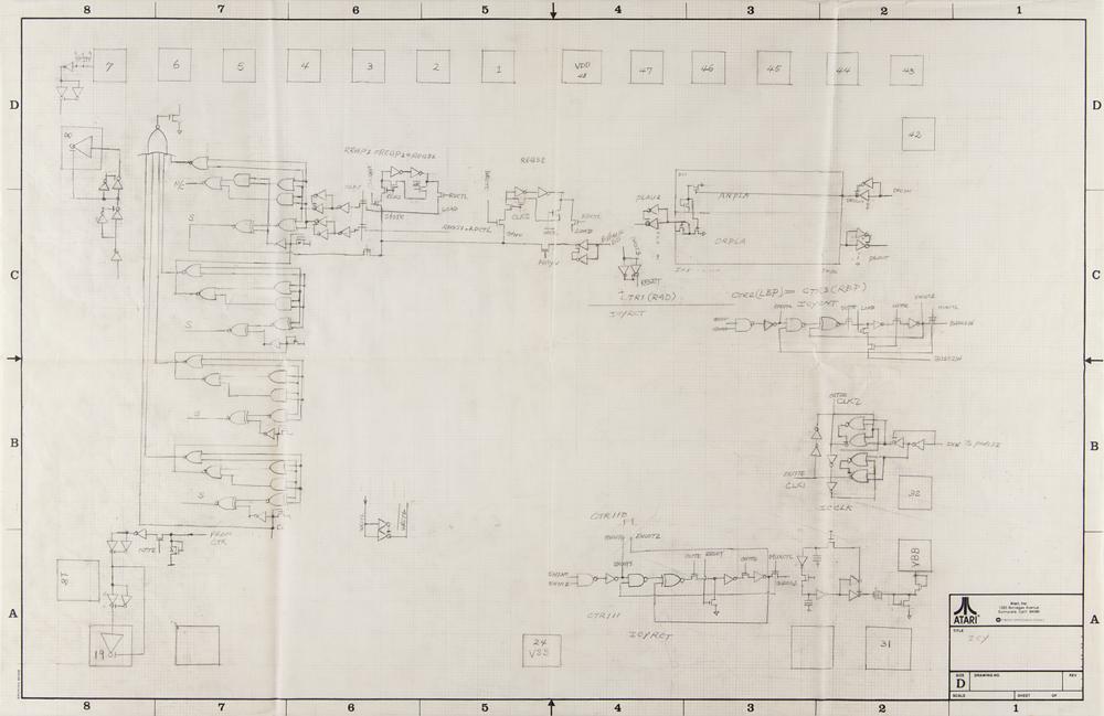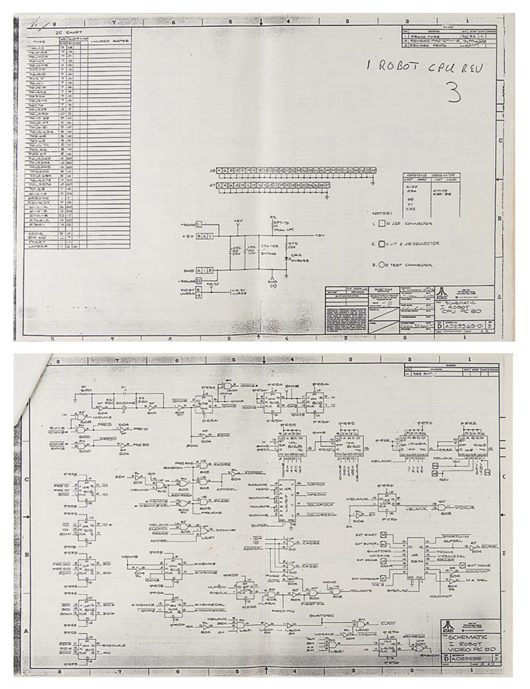 Two complete Atari design review package schematic sets: an eight-page set marked “Schematic, I Robot CPU PC BD” and an 11-page set marked “Schematic, I Robot Video PC BD,” both bearing annotations for corrections to be made for a final set. According to Sherman: ‘This schematic set represents the debugged and production-ready schematics and layout for I, Robot. This was debated to send to production since the ‘ICY’ custom chip was just being debugged and the game could have shipped early with these boards. Management made the decision to wait for the ICY chip since it provided some security against competition ‘cloning’ the system and it obscured the video board operations.’