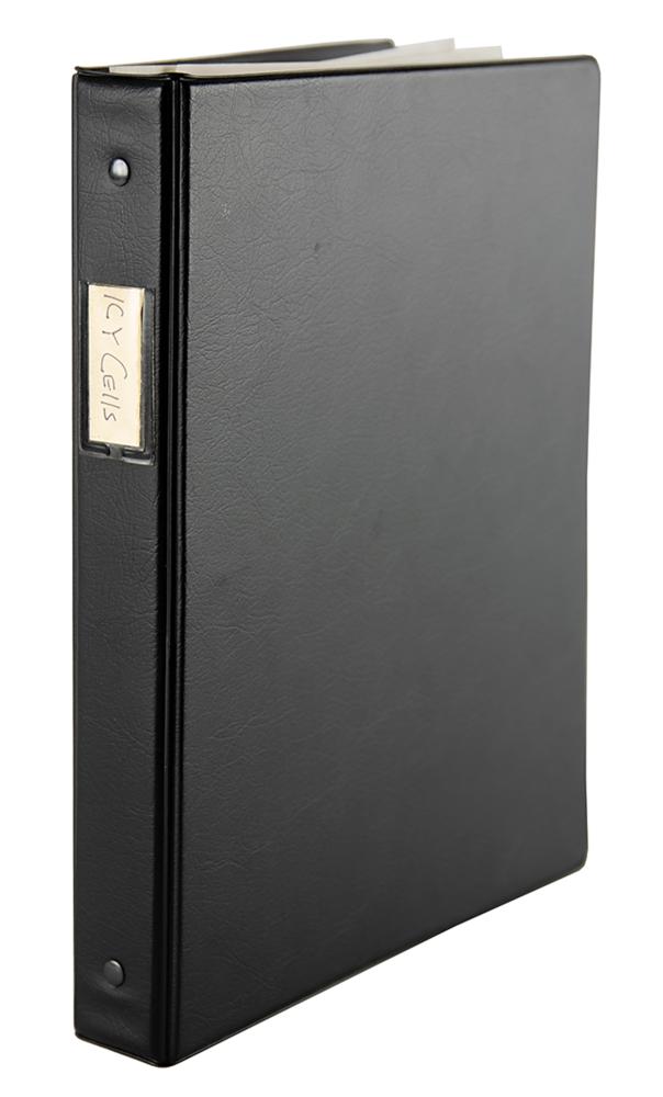 ICY Cells three-ring binder, which contains cell layout for the leaf cells, transistor hand-drawn schematics of cells, in-process chip check plot, signoff documentation, and in-process review document for simulation vectors. In overall fine condition.