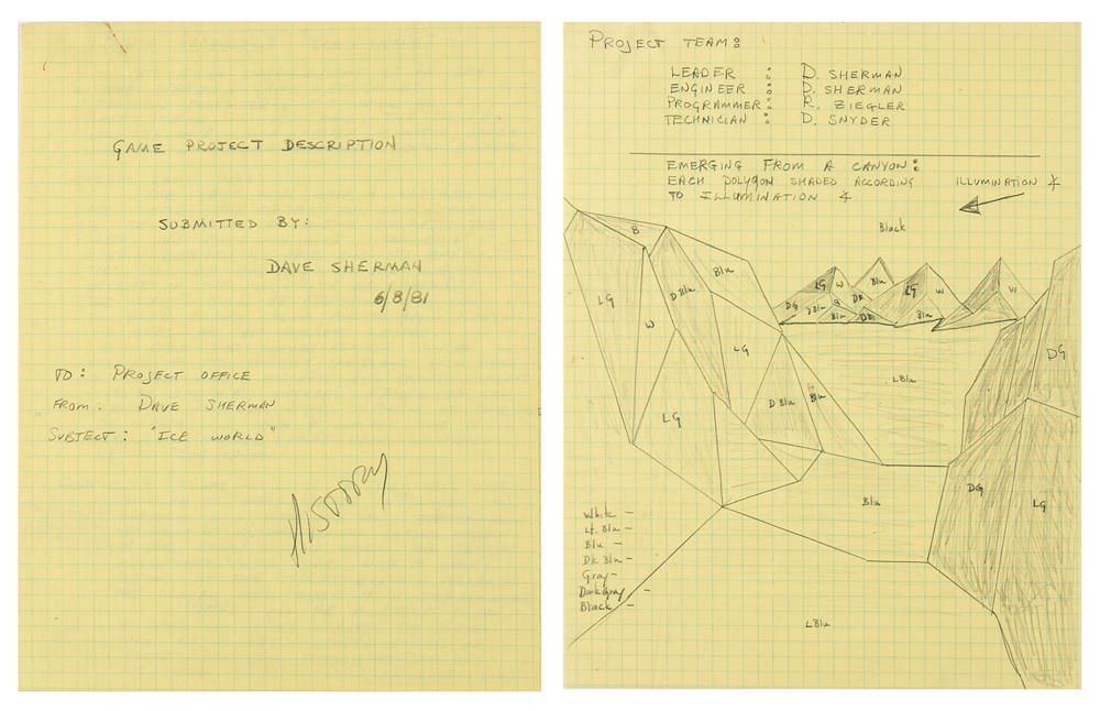 - An interoffice memo and a handwritten game project proposal for “Ice World,” both dated June 8, 1981, with the latter containing a brief game description, control set, timetable, proposed team, and drawings of a typical polygonal mountain scene