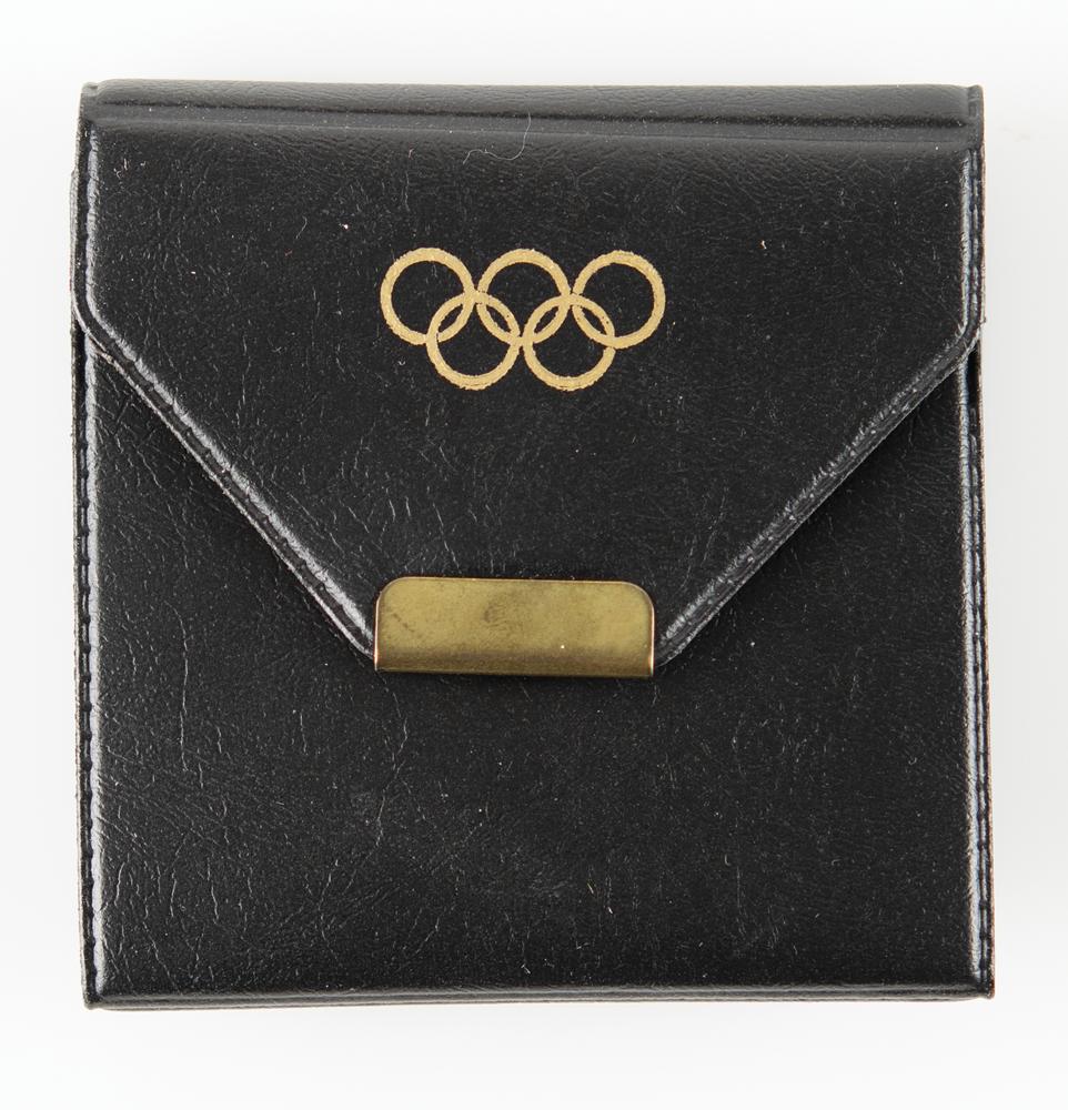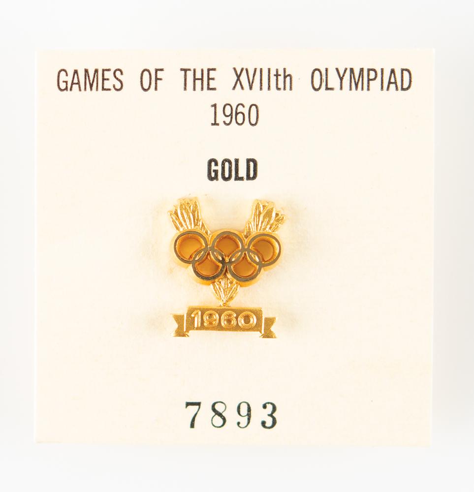 Scarce first-place winner’s pin from the Rome 1960 Summer Olympics. Made by Bertoni of Milan and issued to a gold medal-winning participant at the XVII Olympiad, the gold-tone pin features the Olympic rings above a banner with the contest year. Complete with its original paper backing marked as “7893” (which bears a slight crease) and its black vinyl presentation pouch made by Bertoni. The consignor notes that this pin was presented to a member of the Yugoslavian football (soccer) team that beat Denmark 3-1 in the gold medal match.