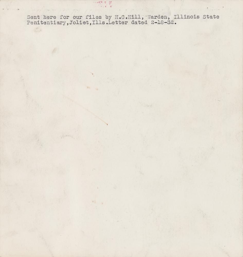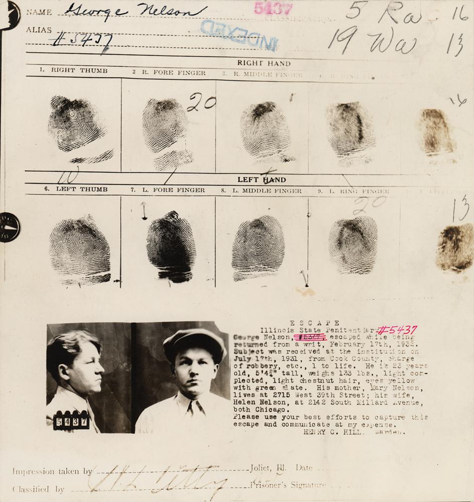 Uncommon original vintage 7.5 x 8 photographic fingerprint card for "George Nelson," depicting his mug shot and ten finger prints, with text describing his escape from Illinois State Penitentiary: "Escaped while being returned from a writ, February 17th, 1932. Subject was received at the institution on July 17th, 1931, from Cook County, charge of robbery, etc., 1 to life. He is 23 years old, 5' 4 3/4" tall, weighs 1333 lbs., light complected, light chestnut hair, eyes yellow with green slate…Please use your best efforts to capture this escape and communicate at my expense." Stamped "Indexed" at the top, with several ballpoint annotations. In fine condition.