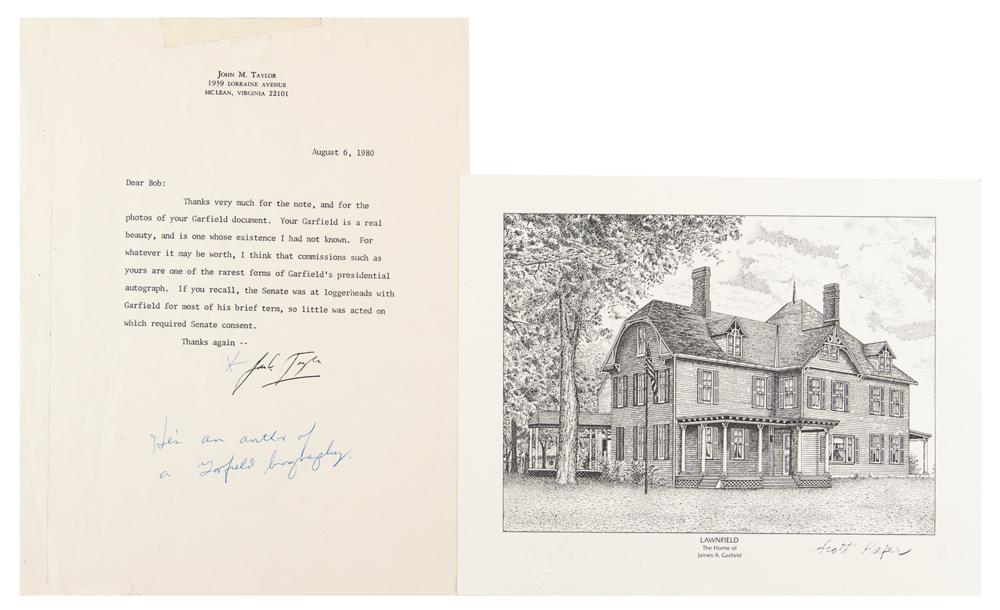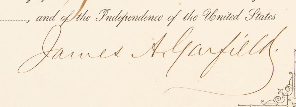 Rare partly-printed DS as president, one page, 21 x 16, June 16, 1881. President Garfield appoints Daniel P. Foley as "Third Lieutenant in the Revenue Service of the United States." Boldly signed at the conclusion by President James A. Garfield and countersigned by Secretary of the Treasury William Windom. In very good to fine condition, with light staining to top edge and upper right corner areas. Accompanied by a full letter of authenticity from JSA, a print of Garfield's 'Lawnfield' home, and a copy of a letter regarding the document by Garfield's biographer, John M. Taylor, in part: "I think that commissions such as yours are one of the rarest forms of Garfield's presidential autograph. If you recall, the Senate was at loggerheads with Garfield for most of his brief term, so little was acted on which required Senate consent." Unlike most Garfield documents signed as president (which are postal commissions and do not require Senate approval), this is the much rarer type of document which required Senate confirmation for the appointment. A very scarce presidential autograph signed by Garfield just weeks before he was shot by Charles Guiteau.