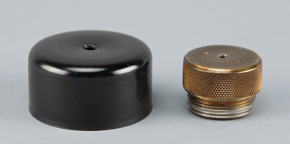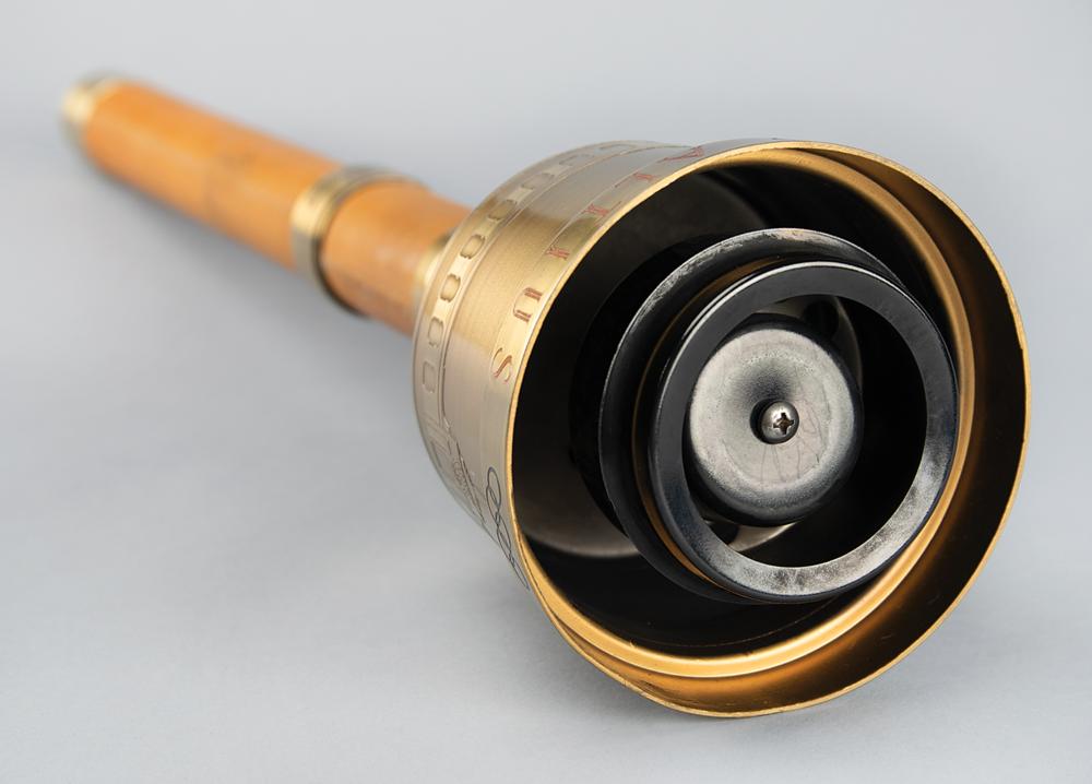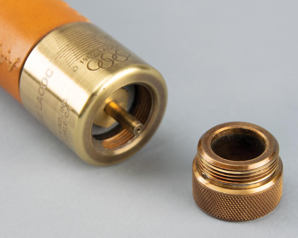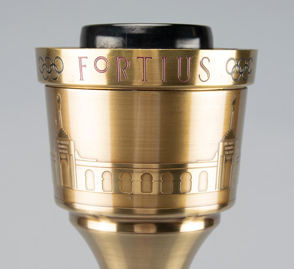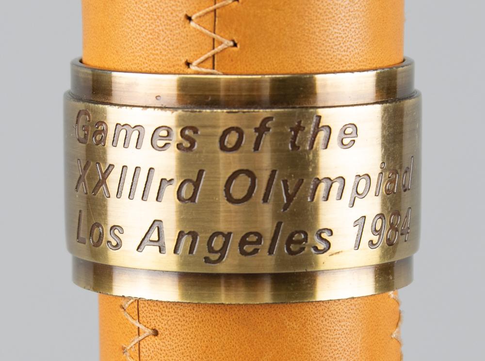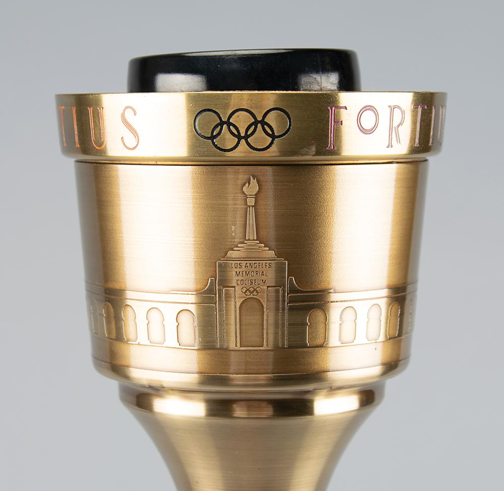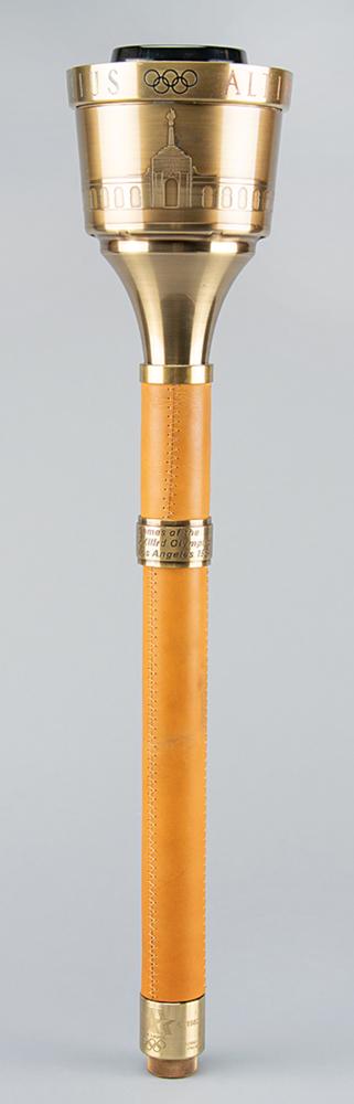 Official 1984 Los Angeles Olympics torch, brass-finished with tan leather handles, measuring 22.25″ in length and 4.75″ at its widest point, manufactured by Turner Ind and engraved “1983 LAOOC,” with a pair of Los Angeles Games logos on the base of the handle. The black burner remains in place, for an overall length of 23″. Bowl is engraved along the top, “Citius, Altius, Fortius, " with the rings between each word, and the L.A. Memorial Coliseum Stadium below. Exhibits some very slight wear to the bowl and handle. Includes its original relay diploma, opening and safety instruction pamphlet, and replacement burner and end caps.