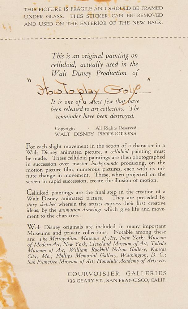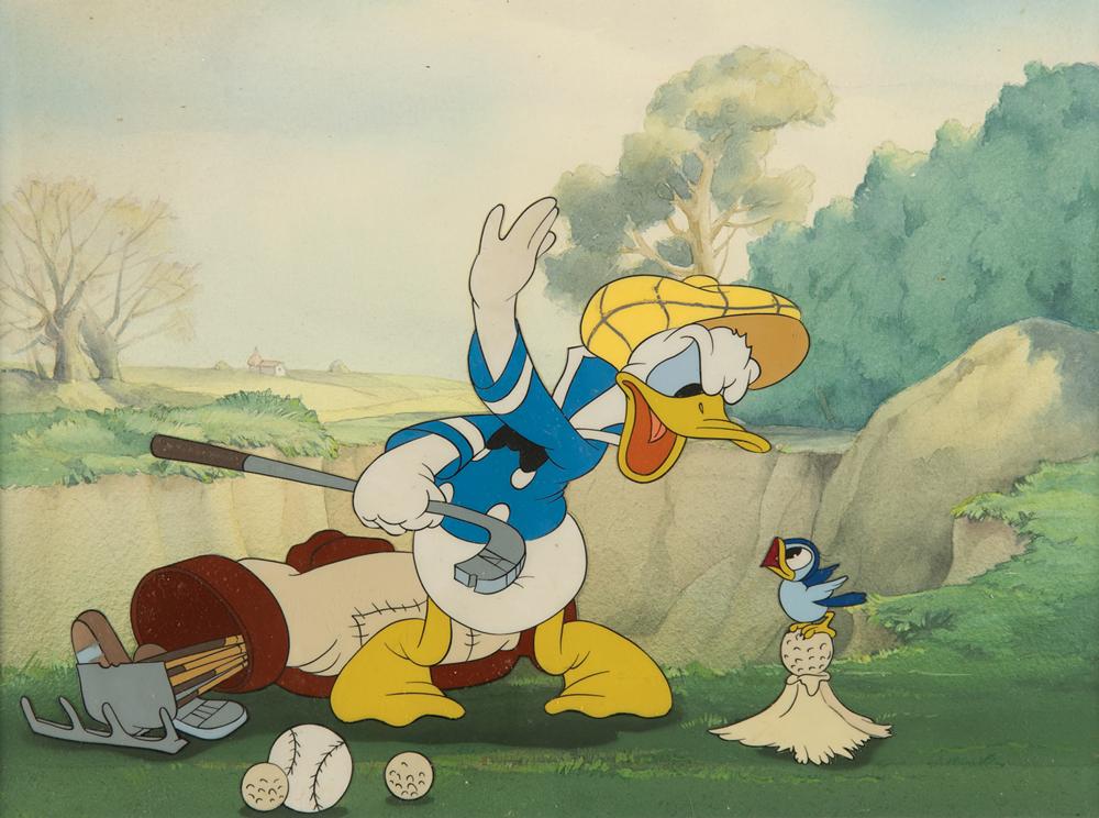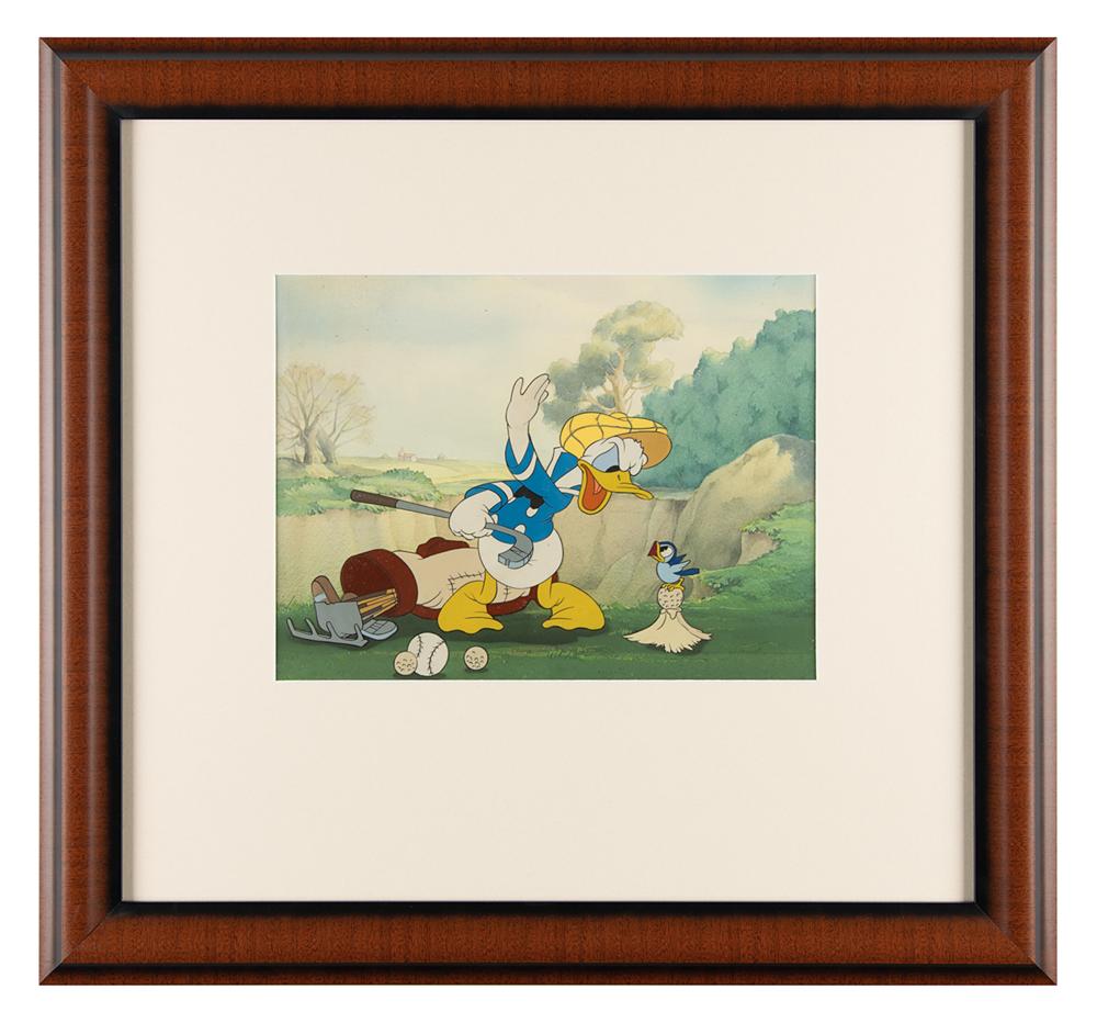 (Walt Disney Studios, 1938) Beautiful original production cels of Donald Duck and a bluebird from Donald's Golf Game, showing the frustrated duck clenching his golf club and set to swipe away a small bluebird perched on his ball. The cels have been trimmed and applied to a hand-painted watercolor production background prepared by the Disney Art Props department. Images measure 7.75 x 6 (Donald with balls and bag) and 2 x 2.25 (bird on mound), with a mat opening of 10.75 x 8.25. Archivally matted and framed to an overall size of 20.5 x 19. In fine condition. Accompanied by a Courvoisier Galleries label affirming that this "is an original painting on celluloid, actually used in the Walt Disney production of 'How to Play Golf'"; our research indicates that the title appears to be misidentified and that the actual cartoon is Donald's Golf Game.