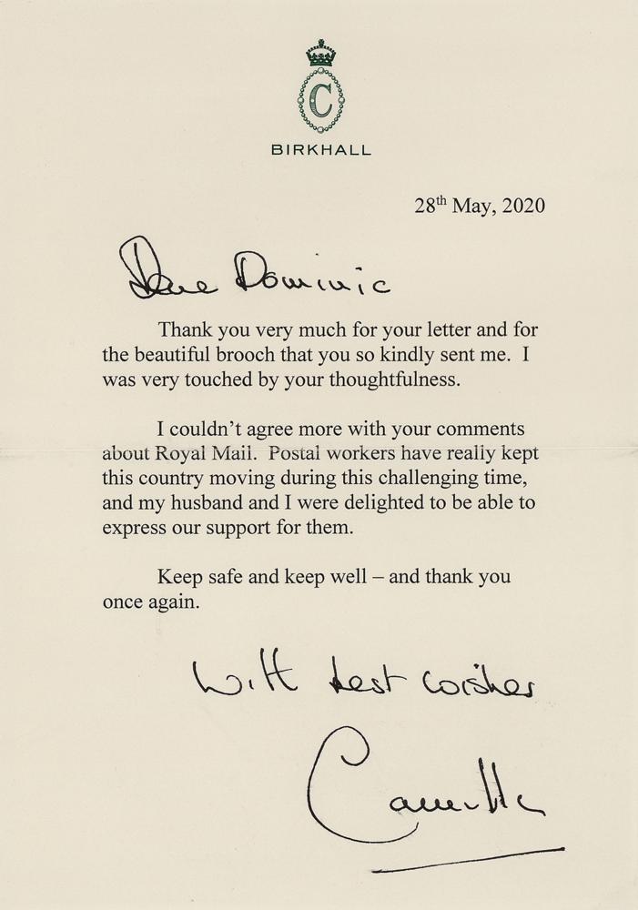 TLS signed “with best wishes, Camilla,” one page, 5.75 x 8.25, Birkhall letterhead, May 28, 2020. Letter to Dominic Hourd, in full: “Thank you very much for your letter and for the beautiful brooch that you so kindly sent me. I was very touched by y our thoughtfulness. I couldn’t agree more with your comments about Royal Mail. Postal workers have really kept this country moving during this challenging time, and my husband and I were delighted to be able to express our support for them. Keep safe and keep well—and thank you once again.” Camilla adds the valediction in her own hand. In very fine condition. Accompanied by the original mailing envelope.