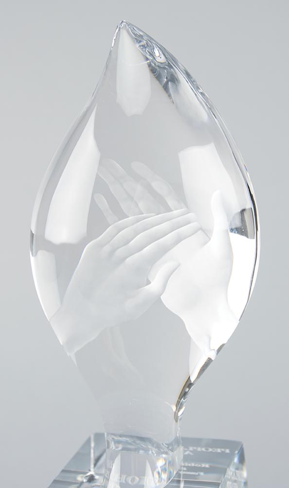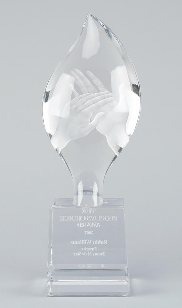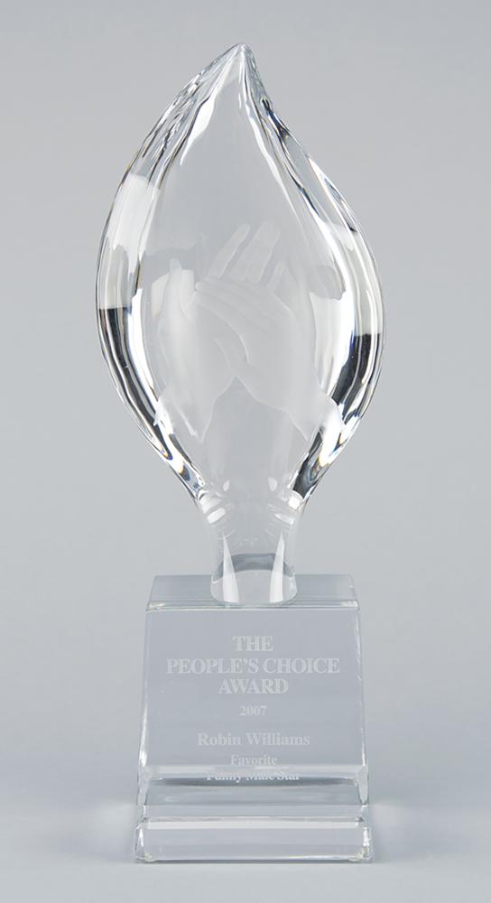 People's Choice Award presented to Robin Williams as "Favorite Funny Male Star" for the 33rd Annual People's Choice Awards, held at Shrine Auditorium in Los Angeles on January 9, 2007. Made by Orrefors, the gorgeous crystal award measures 13.75″ tall with a square base of 4″, neatly engraved on the front: "The People's Choice Award, 2007, Robin Williams, Favorite Funny Male Star." The beautiful award takes the shape of a flame and is etched with the image of hands clapping. The award is in very fine condition; the original Orrefors box exhibits substantial wear.