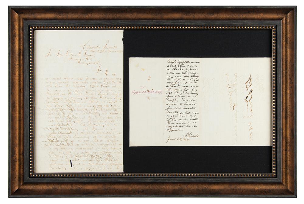 The letter to Stanton, written from Cadwalader Barracks in Philadelphia on June 18, 1864, describes Captain O. B. Griffith's career of service and recommends his promotion: "When the first gun was opened on Fort Sumpter, Capt. Griffith immediately started a company for the war. He joined the 82nd Penna. Vols., and has proved himself a soldier on many a hard fought field. At the battle of Fredericksburg, in charging Marye's Heights, Capt. Griffith was highly complimented upon the battle-field, amid a shower of bullets, by his Colonel, for his bravery. As the Captain is now unable to perform duty with his company, owing to his wound, the undersigned officers, respectfully ask that he be commissioned Assistant Quartermaster, or Assistant Commissary of Subsistence, as a reward for his long and faithful services." Archivally corner-mounted and framed to an overall size of 24 x 16. In fine condition, with a tiny hole at the bottom of the first page. Accompanied by color copies of the reverse of each page. A superb, highly desirable presidential endorsement in support of a Civil War hero.