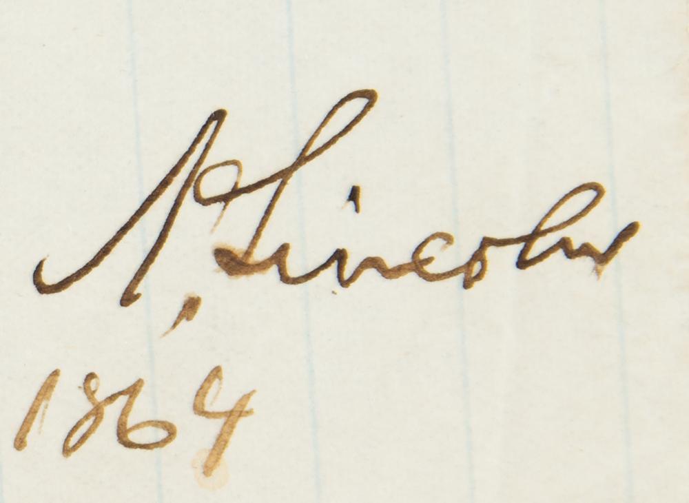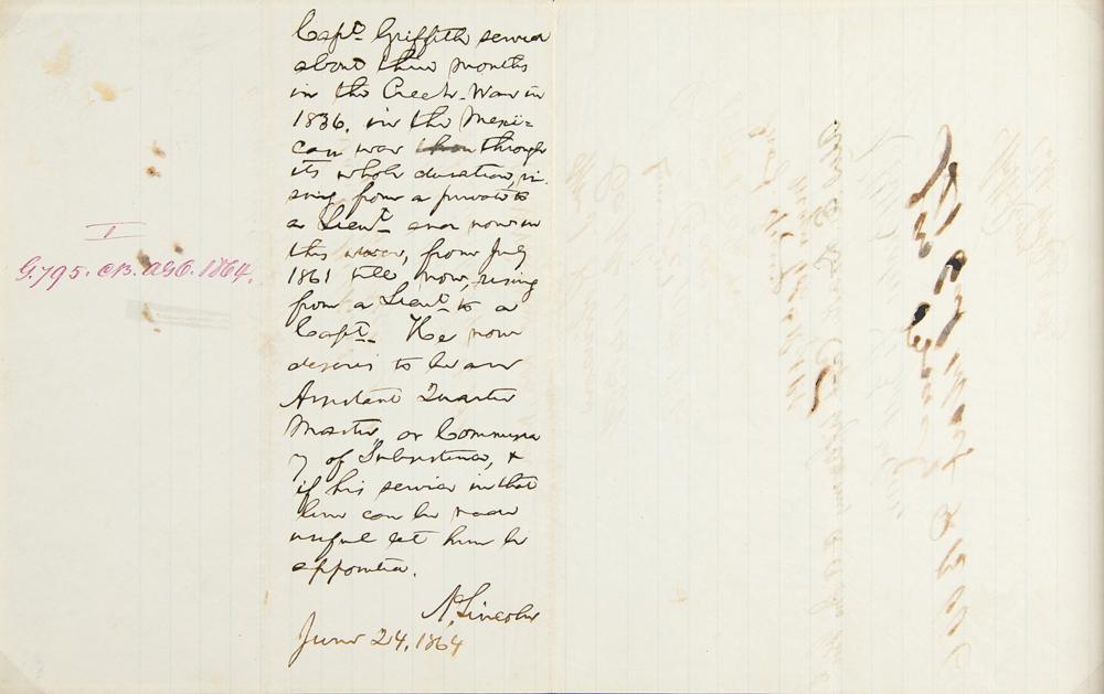 Historic autograph endorsement signed as president, “A. Lincoln,” originally penned on the reverse of a letter written to Secretary of War Edwin Stanton and signed by more than 30 officers of the Pennsylvania Volunteers, two pages both sides (split at central fold for framing), 7.5 x 12, June 24, 1864. President Lincoln endorses the promotion of a captain in the 82nd Pennsylvania Volunteer Infantry. Lincoln writes, in full: "Capt. Griffith served about three months in the Creek War in 1836, in the Mexican War through its whole duration, rising from a private to a Lieut., and now in this war, from July 1861 till now, rising from a Lieut. to a Capt. He now desires to be an Assistant Quarter Master, or Commissary of Subsistence, & if his service in that line can be now useful let him be appointed."