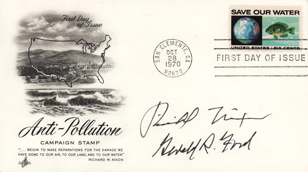FDC with a cachet honoring an anti-pollution campaign, signed in black felt tip by Richard Nixon and Gerald R. Ford. In very fine condition.
