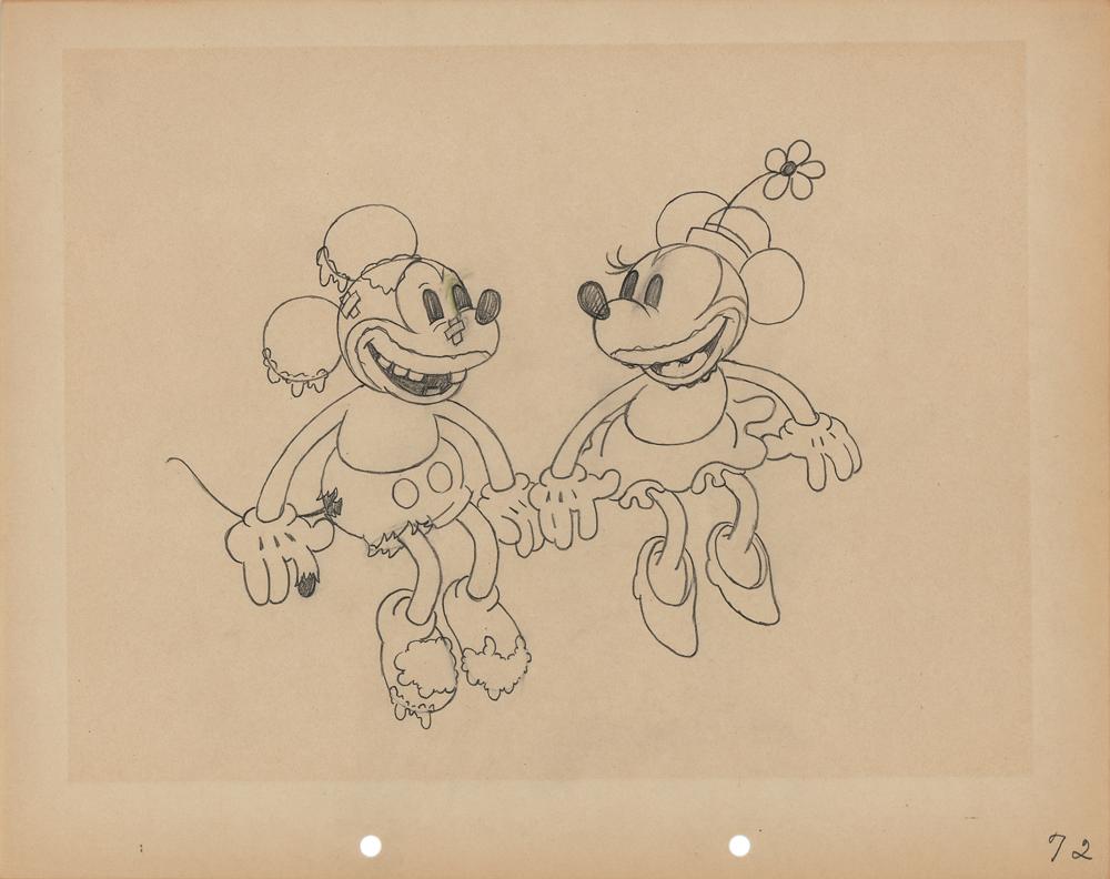 (Walt Disney Studios, 1932) Original production drawing featuring Mickey and Minnie Mouse from Touchdown Mickey, which shows a bruised Mickey just moments after planting a muddy smooch on Minnie at the end of the short. Accomplished in graphite on untrimmed 12 x 9.5 animation paper marked "72" in the lower right corner. Image measures 7.5 x 6.5. In fine condition, with a faint box of toning from prior display.