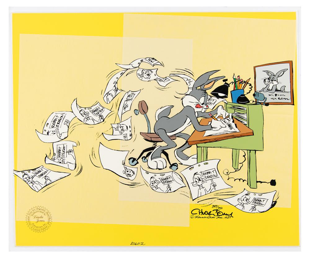 (Warner Brothers, 1989) Limited edition hand-painted animation cel entitled ‘Bugs Director,' numbered 347/750, signed in black felt tip by Chuck Jones. The scene shows Bugs furiously sketching out Daffy Duck 'Rabbit Season' animation drawings. The cel is placed on a 16.5 x 13.5 color litho background. Lower left bears a golden Linda Jones Enterprises seal. In fine condition. Accompanied by a certificate of authenticity from Linda Jones Enterprises.