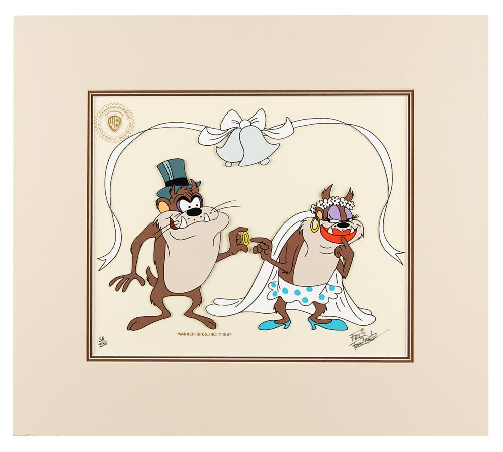 (Warner Brothers Studios, 1987) Limited edition hand-painted cel featuring the Tasmanian Devil putting a finger on his bride's finger, numbered 58/200, signed in the lower right in black felt tip by legendary Looney Tunes animator Friz Freleng. Total image measures 11.5 x 8.5, with a mat opening of 12 x 10. Triple-matted to an overall size of 18 x 16. In fine condition. A very early, small edition.