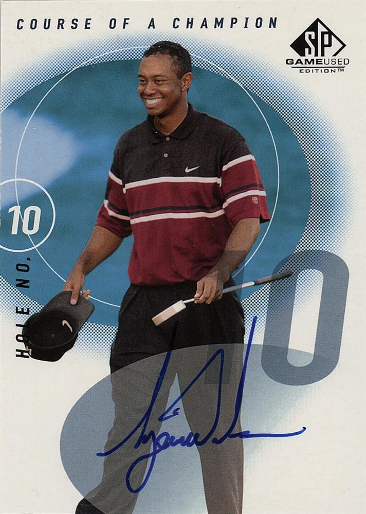 Uncommon and ultra-desirable 2002 SP Game Used Edition 'Course of a Champion' golf card, signed in blue felt tip by Tiger Woods. In very fine condition.