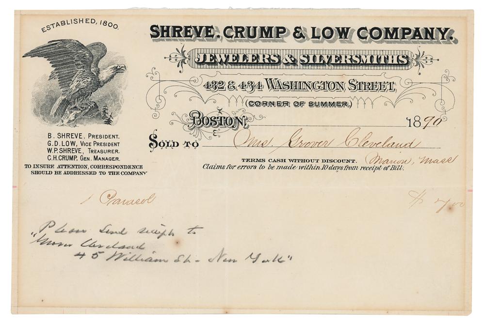 Partly-printed DS, one page, 8.25 x 5.5, 1890. Shreve, Crump & Low receipt for the sale of "1 Parasol - $7.00" to Mrs. Grover Cleveland, signed in the lower left in pencil by Grover Cleveland: "Please sent receipt to 'Grover Cleveland, 45 William St., New York.'" In fine condition, with light toning from prior display.