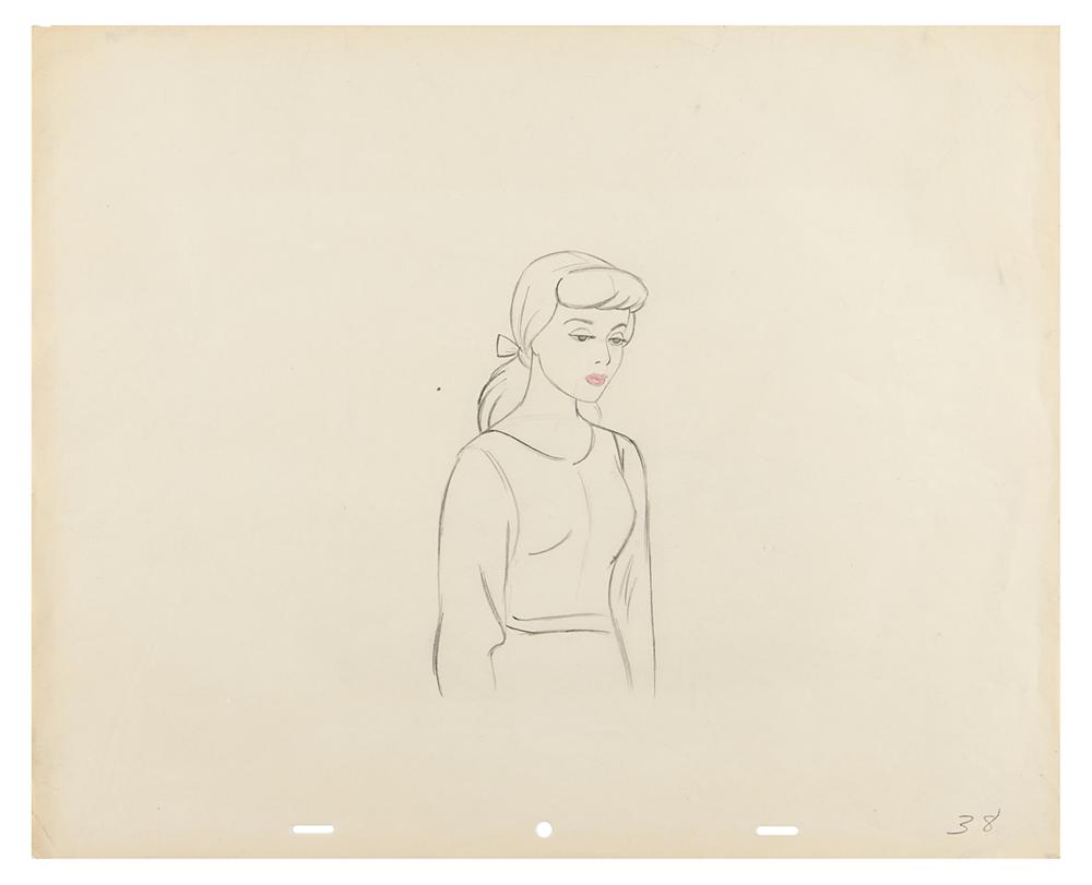 (Walt Disney Studios, 1950) Original production drawing of the title character from Cinderella, which depicts the future princess dressed as a scullion in a beautiful yet forlorn half-length pose. Accomplished in graphite and colored pencil on untrimmed 15.5 x 12.5 animation paper marked "38" in the lower right corner. Image measures 3.5 x 7. In fine condition, with a small tear to top edge and trivial corner creases.