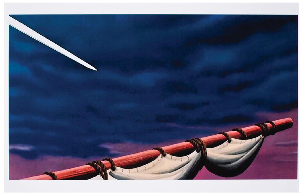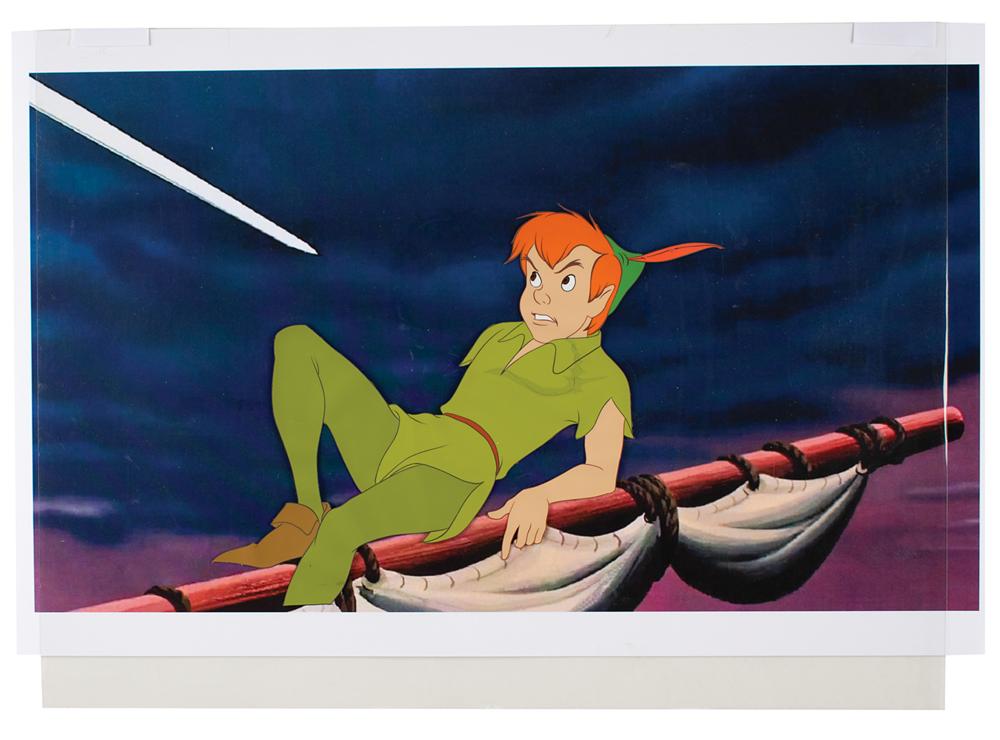 (Walt Disney Studios, 1953) Large and dramatic original production cel featuring Peter Pan from Peter Pan, showing him crawling backwards on the ship's mast at Captain Hook's sword point. The cel is placed on a matching color copy background. Image measures 9 x 7, with overall dimensions of 17 x 12. In fine condition, with hairline cracks to paint in his chest.
