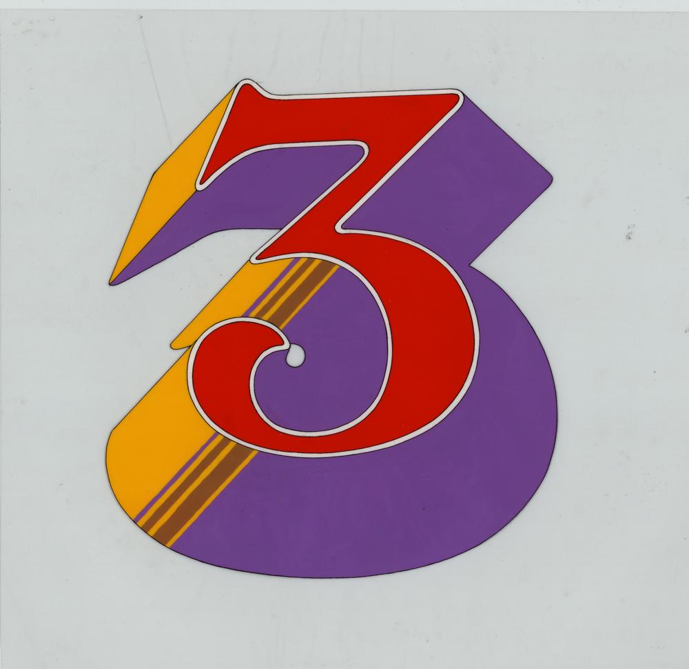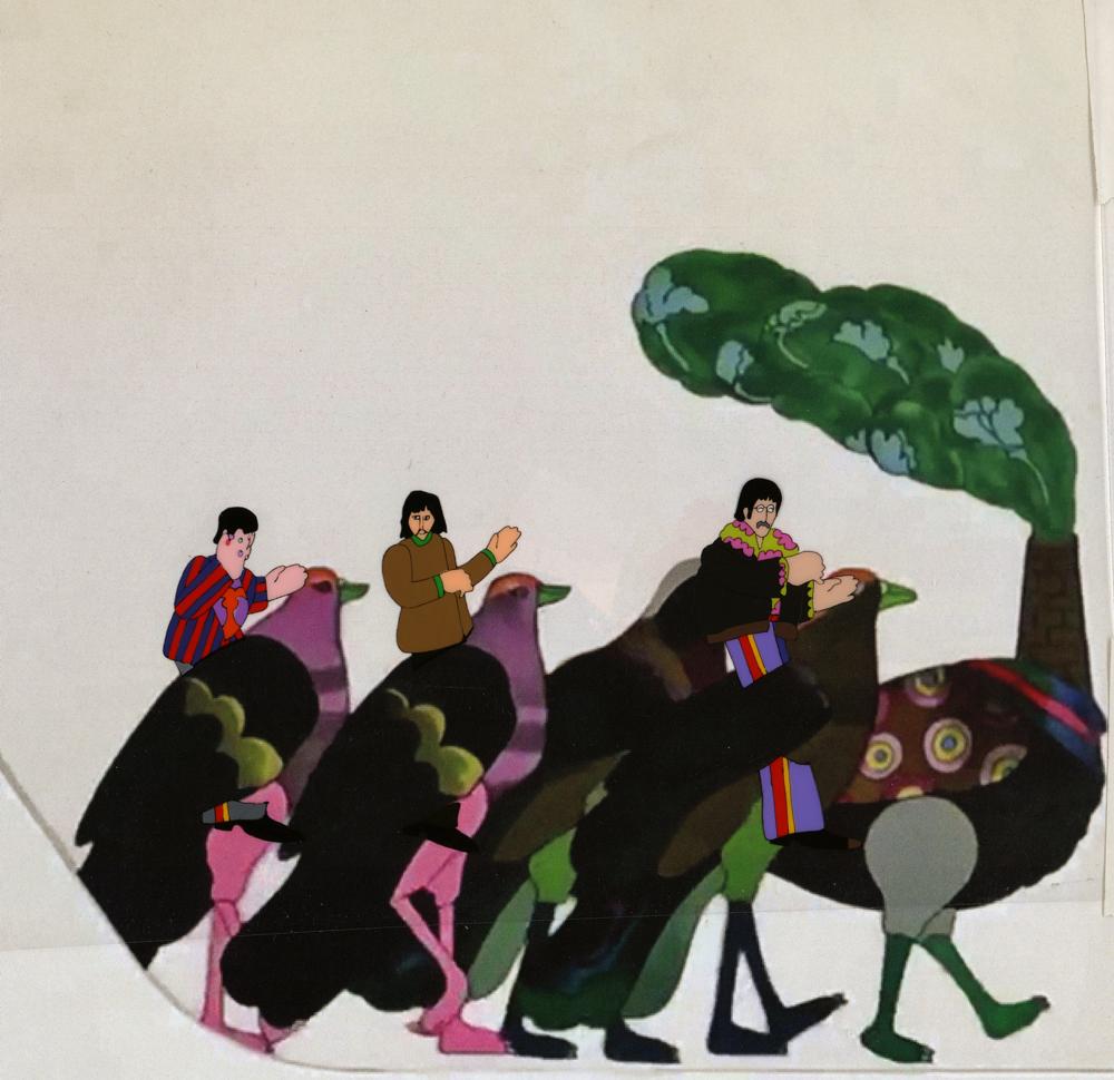 (King Features, 1968) Original production cel of John Lennon, George Harrison, and Ringo Starr from the animated Beatles film Yellow Submarine, which shows the three cartoon musicians in half-length poses; the cel is placed on a color print key background that depicts them riding giant birds. Also includes a production cel from the same film, which contains a large stylized image of a large number "3." Both cels are slightly trimmed to 13.75 x 10 and 10.5 x 8.5. The Lennon, Harrison, and Starr images each approximately measure 1.25 x 1.25 and the "3" cel image measures 5.75 x 6.25. In overall very good to fine condition, with a few trivial marks and creases and staple holes to corners.