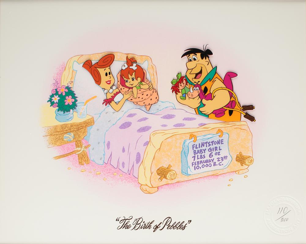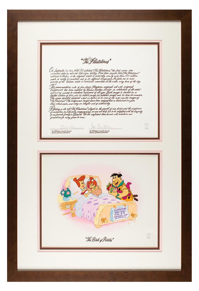 (Hanna-Barbera Studios, 1993) Very desirable original limited edition serigraph cel entitled 'The Birth of Pebbles,' numbered 110/200, depicting Fred Flintsone carrying toys and visiting his wife Wilma and his new baby daughter, Pebbles; a sign on the hospital bed reads: “Flintstone, Baby Girl, 7 lbs 6 oz, February 23rd, 10,000 B.C.” Includes its rare original letter of authenticity that is signed in pencil by Bill Hanna and Joe Barbera. The cel, which measures 13.5 x 10.75, is placed on a color serigraph background on Westwind 300-gram blanc-colored paper, and the character images measure 3.75 x 3.25 (Fred) and 3.25 x 2.5 (Wilma and Pebbles). Both the background and the LOA feature a matching intaglio seal of authenticity, and both are attractively triple-matted and framed together to an overall size of 21.75 x 32. In fine condition. This serigraph is one of a suite of four designs that were produced to commemorate the enduring success of the Flinstones franchise.
