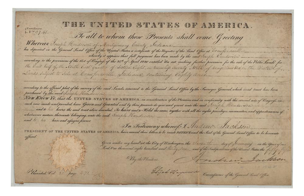 Partly-printed vellum DS as president, one page, 15.75 x 10, January 7, 1831. President Jackson grants Joseph Henderson of Montgomery County, Indiana, a parcel of land "at Crawfordsville, Indiana, containing Eighty acres." Prominently signed at the conclusion in ink by President Andrew Jackson and countersigned by Commissioner of the General Land Office Elijah Hayward. The white paper seal affixed to the lower left remains intact. In fine condition.
