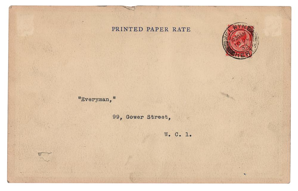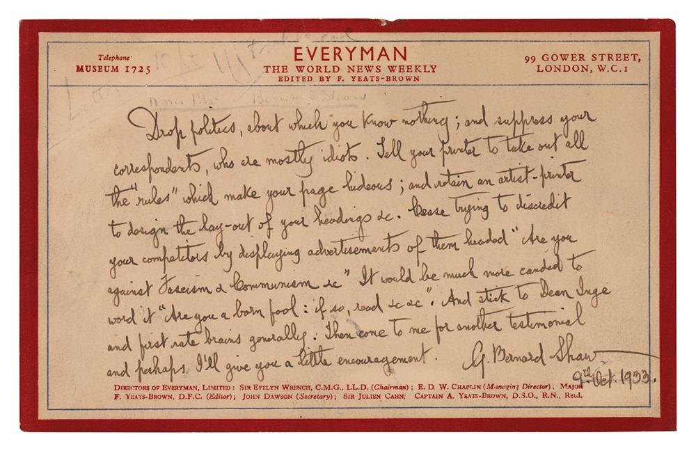 ALS signed “G. Bernard Shaw,” one page, 8 x 5.25, Everyman, The World News Weekly mailing card letterhead, October 9, 1933. Scathing and humorous handwritten letter from Shaw to an apparent publisher, in full: “Drop politics, about which you know nothing; and suppress your correspondents, who are mostly idiots. Tell your printer to take out all the ‘rules’ which make your page hideous; and retain an artist-printer to design the lay-out of your headings etc. Cease trying to discredit your competitors by displaying advertisements of them headed ‘Are you against Fascism & Communism etc.’ It would be much more candid to word it ‘Are you a born fool: if so, read etc etc.’ And stick to Dean Inge and first rate brains generally. Then come to me for another testimonial and perhaps I’ll give you a little encouragement.” In fine condition.