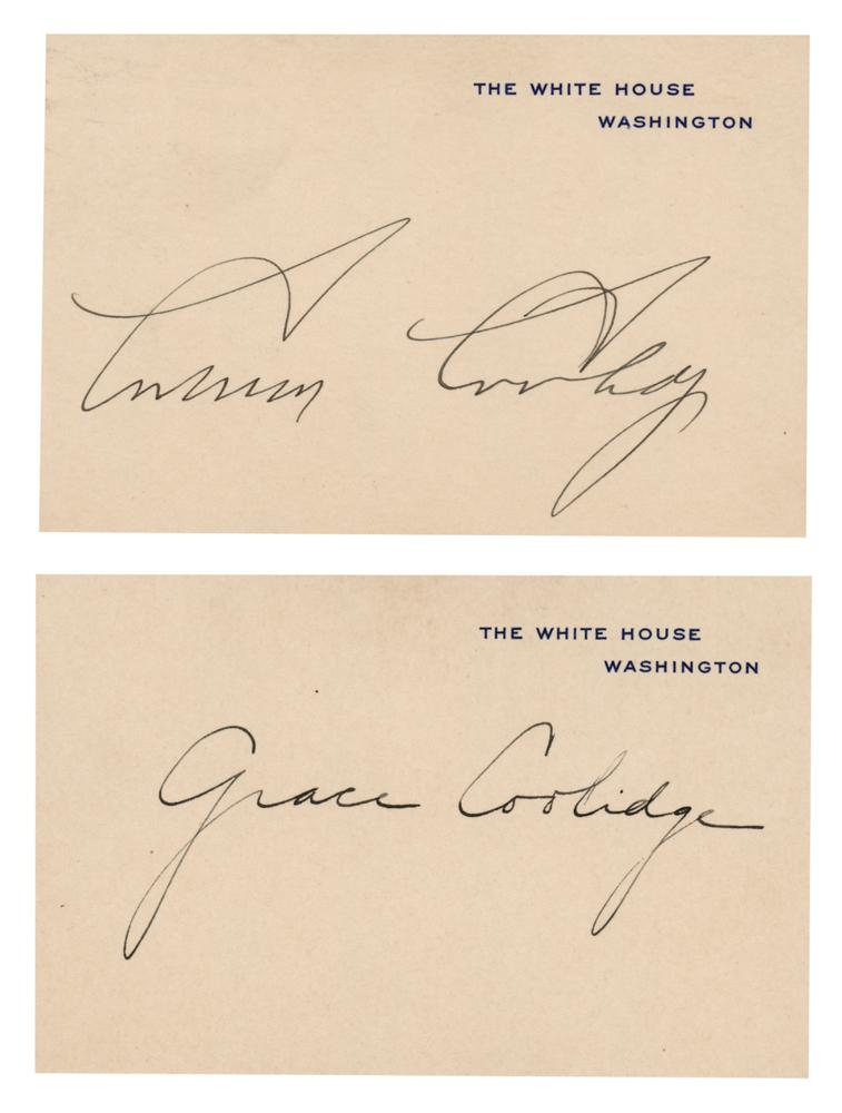 Two White House cards, both 4.25 x 2.75, individually signed in fountain pen by Calvin and Grace Coolidge; the Calvin White House card is signed as president. Includes an ink signature of their son, John C. Coolidge, on an off-white 3.5 x 2.5 card. In overall very fine condition.