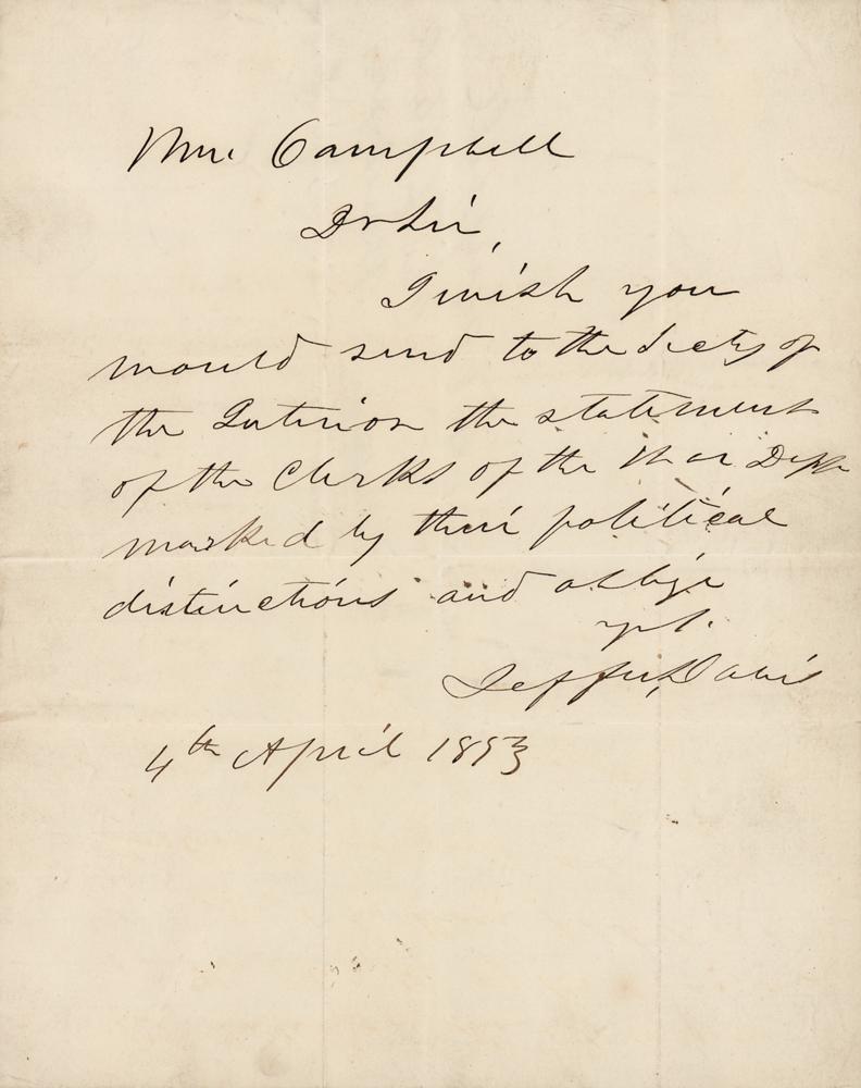ALS signed “Jeffer. Davis,” one page, 7.75 x 9.75, April 4, 1853. Handwritten letter to Archibald Campbell, the Chief Clerk of the War Department, in full: “I wish you would send to the Sect’y of the Interior the statement of the clerks of the War Dep’t., marked by their political distinctions and oblige.” In fine condition. After winning the 1852 presidential election, Franklin Pierce appointed Jefferson Davis as his Secretary of War on March 7, 1853, less than a month before he wrote this letter.