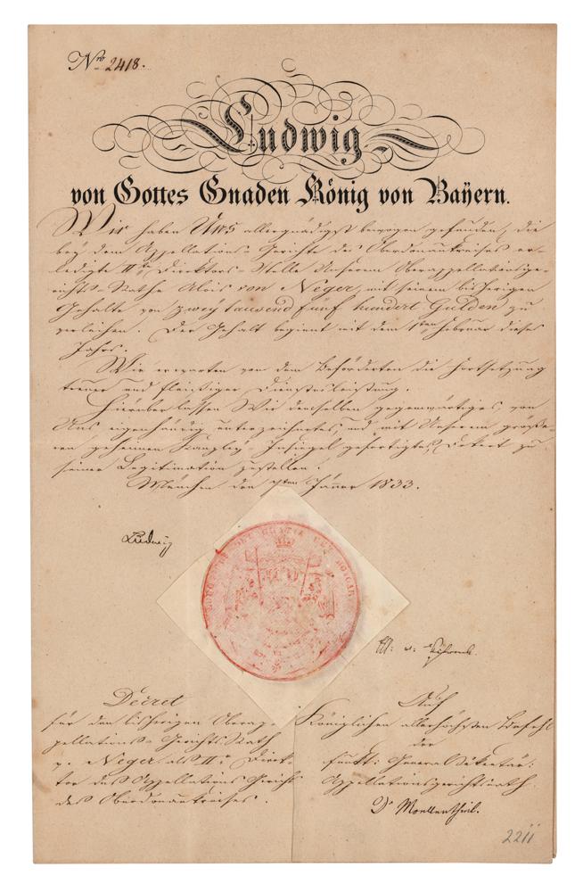 King of Bavaria from 1825 until the 1848 revolutions in the German states (1786-1868). Scarce manuscript DS in German, signed “Ludwig,” one page, 8.25 x 13.25, February 1833. An untranslated decree signed neatly in the lower left by King Ludwig I of Bavaria. The document retains its original embossed paper seal. In fine condition.