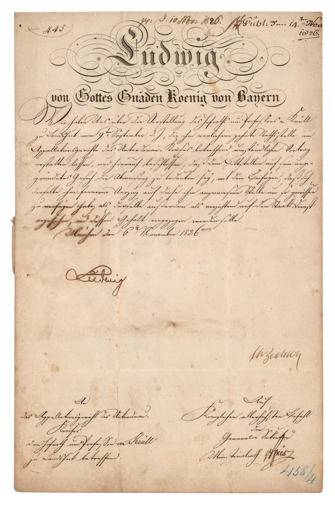 King of Bavaria from 1825 until the 1848 revolutions in the German states (1786-1868). Scarce manuscript DS in German, signed “Ludwig,” one page, 8.5 x 13.25, November 6, 1826. An untranslated document signed in the lower left by King Ludwig I of Bavaria. The original embossed paper seal remains affixed to the reverse of the second integral page. In very good to fine condition, with light soiling and toning.