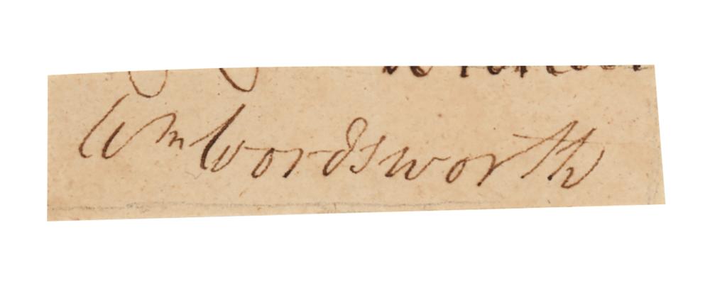 Scarce ink signature, "Wm. Wordsworth,” on an off-white 2.5 x .5 slip. In fine condition. Accompanied by a modern postcard of the English Romantic poet that bears a facsimile signature.