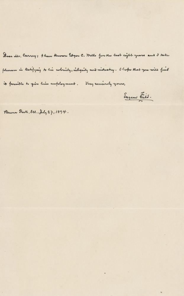 American writer (1850-1895) best known for his poems of childhood, including 'Wynken, Blynken, and Nod' and 'Little Boy Blue.' Beautifully and neatly penned ALS, one page, 5 x 8, July 27, 1894. Addressed from Buena Park, Illinois, a handwritten letter to author J. Seymour Currey, in full: “I have known Edgar C. Wells for the last eight years and I take pleasure in testifying to his sobriety, integrity and industry. I hope that you will find it possible to give him employment.” In fine condition. Accompanied by the original transmittal envelope, which is also addressed by Field.