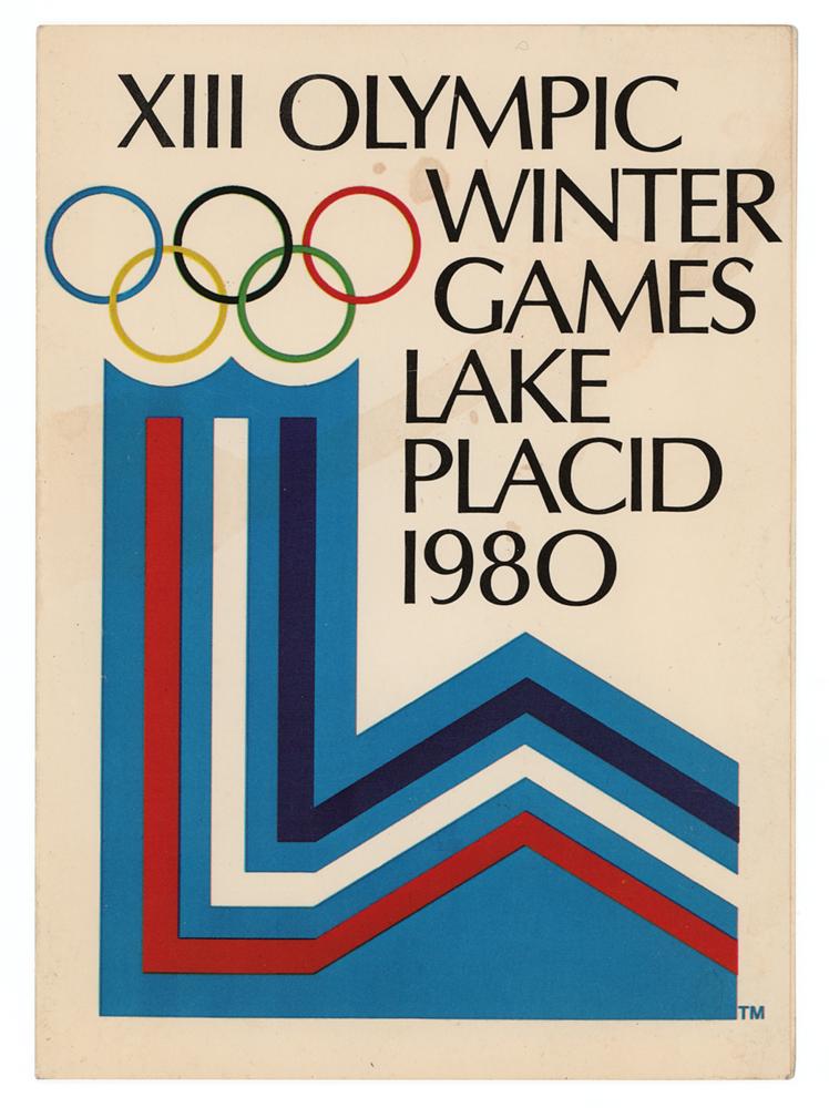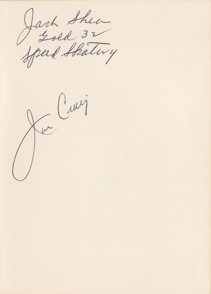 Greeting card with the front featuring the logo of the Lake Placid 1980 Winter Olympics, measures 10 x 7 open, signed inside in black ballpoint by two gold medal-winning American athletes: Jack Shea, who became the first American to win two gold medals at one Winter Olympics when he placed first in the 500-meter and 1500-meter events at the Lake Placid 1932 Winter Olympics; and Jim Craig, the goaltender for the Team USA men’s hockey team that won the gold medal at the 1980 Winter Games. Craig had a standout Olympic tournament, including stopping 36 of 39 shots on goal by the heavily favored Soviet Union in the 'Miracle on Ice,’ as the U.S. won 4-3, in what is widely considered one of the greatest upsets in sports history. In fine condition, with a light stain to the front cover.