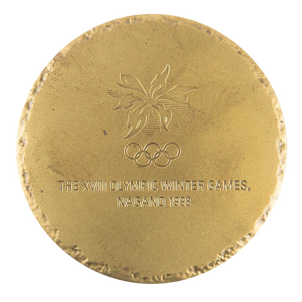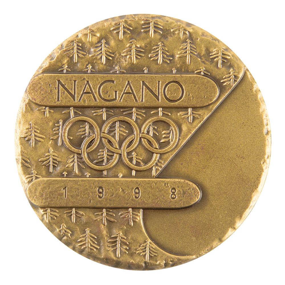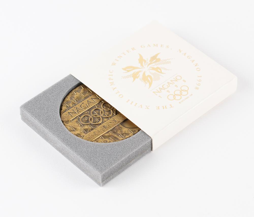 Participation medal issued for the Nagano 1998 Winter Olympics. Bronze, 60 mm, 137 gm. The front features a forest of small trees on a mountainside with a curve denoting a ski slope; the reverse bears the Nagano Games logo and a wreath effect along the rim. Complete with the original paper case and foam holder, as well as its scarce Mizuhiki presentation gift with box.
