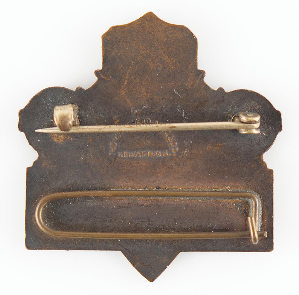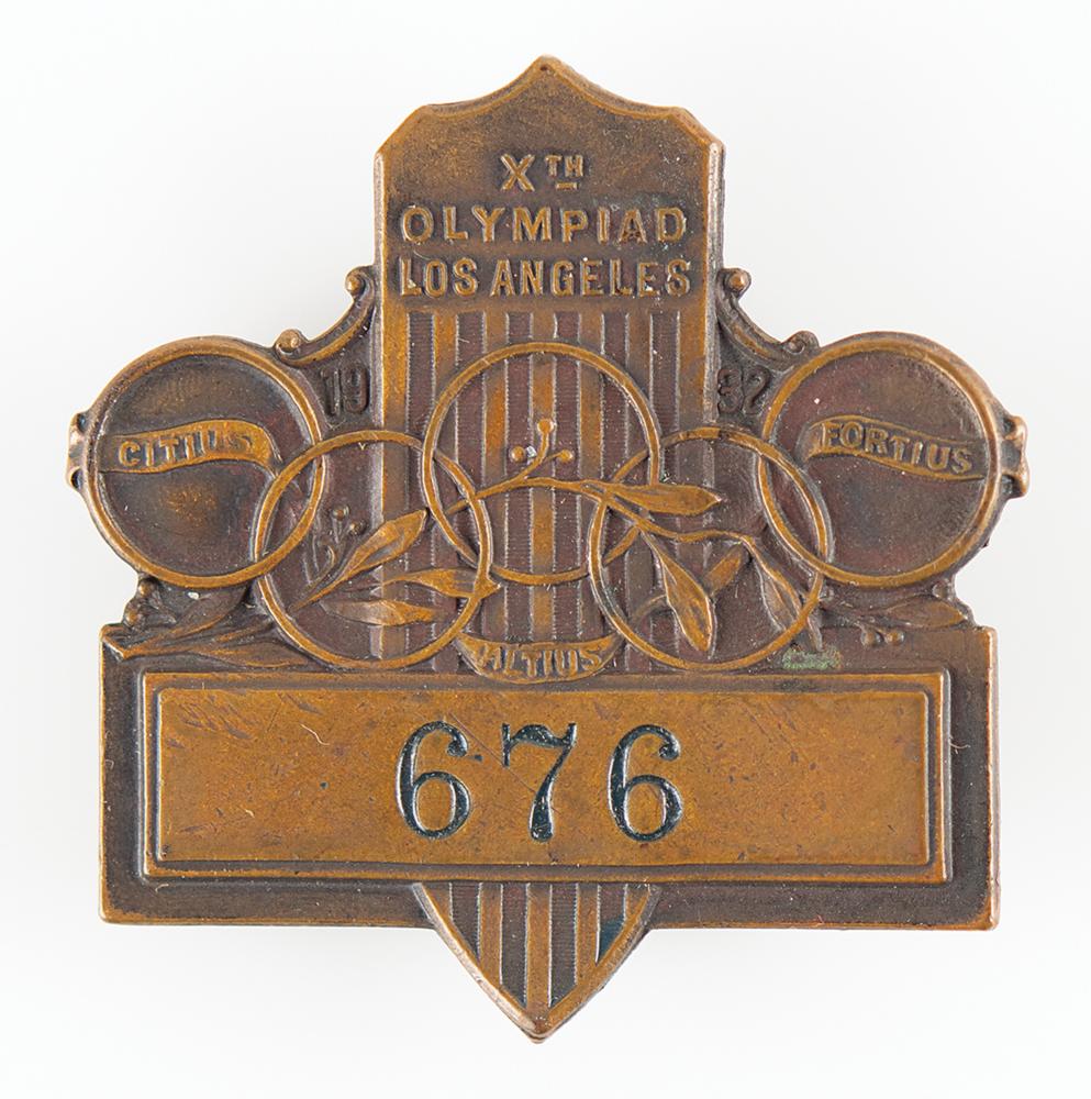 Competitor’s badge issued for the 1932 Los Angeles Olympic Games. Bronze, 38 mm x 63 mm, 13 gm, manufactured by Whitehead & Hoag of Newark. The medal features the Olympics rings over a shield and laurel branch, and is engraved “Xth Olympiad Los Angeles,” with number below, “676.” The badge’s ribbon is not present. Badges with bronze medallions were issued to team managers, athletes, attendants, and to the press. Each athlete badge was serially numbered and bore a short piece of colored ribbon, which indicated the sport in which the athlete was a competitor. These badges were good for admission to the athlete sections in the Olympic Stadium, the Olympic Village, and to the training quarters at the apropos stadium.