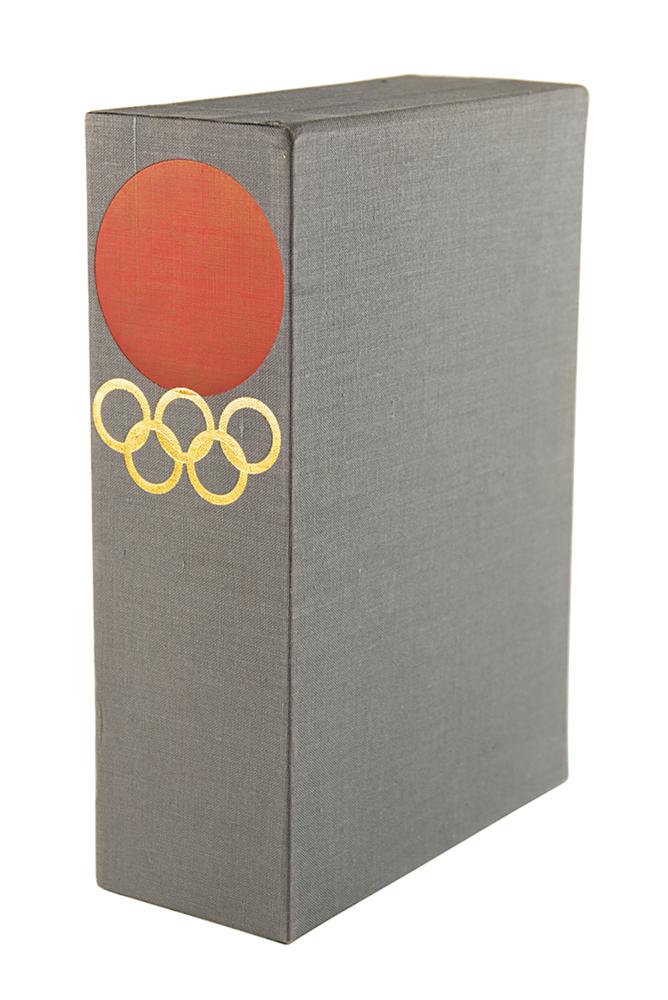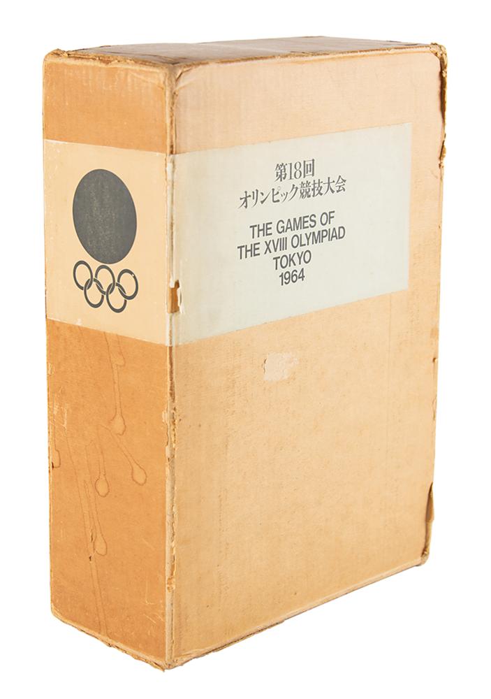 Scarce book set: The Games of the XVIII Olympiad, Tokyo 1964: The Official Report of the Organizing Committee, Vols. 1-2 (English version). Tokyo: Kyoto Printing Co., 1966. Hardcovers in their original slipcase, 8.75 x 12.5, totaling 1358 pages plus one folded map. The first volume chronicles preparations for the Games; volume two documents the athletic events and their results. Book condition: VG/None in a VG slipcase, with a few light stains and minor wear to boards, and some creases and folds to the opening and closing end papers. Accompanied by the original cardboard box, which bears overall wear and some stains.