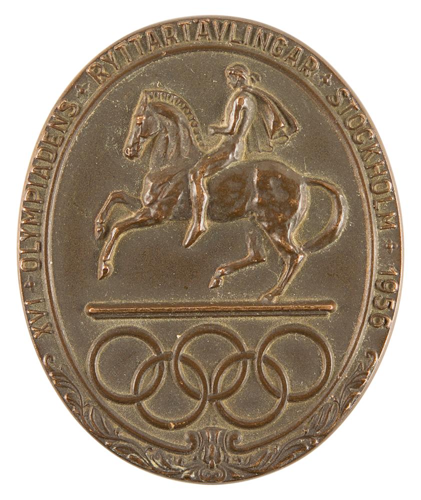 Participation medal issued for the equestrian events held in Stockholm for the Melbourne 1956 Summer Olympics. Bronze, 38 mm x 50 mm, 39 gm, by John Sjosvard. Inspired by a sculpture in the Parthenon, the front, inscribed around the upper border, "XVI Olympiadens Ryttartavlingar Stockholm 1956," features an ancient Greek horse and rider on a platform, with the Olympic rings below; the reverse face is plain. Due to Australian agricultural quarantine regulations, the equestrian events of the XVI Olympiad were held five months earlier in Stockholm, Sweden, making the 1956 Summer Games the second Olympics not to be held entirely in one country; the 1920 Olympics, which Antwerp, Belgium co-hosted with Amsterdam and Ostend, were the first. Given the low number of participants in the equestrian events—158 in total—Stockholm medals remain rare and highly sought-after.