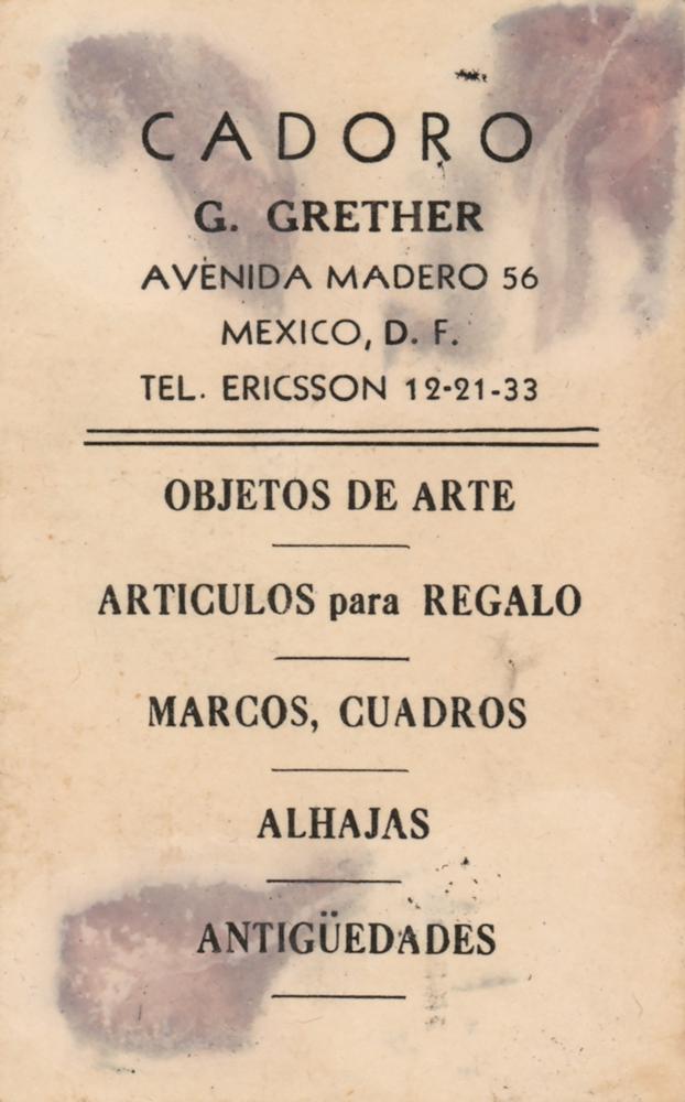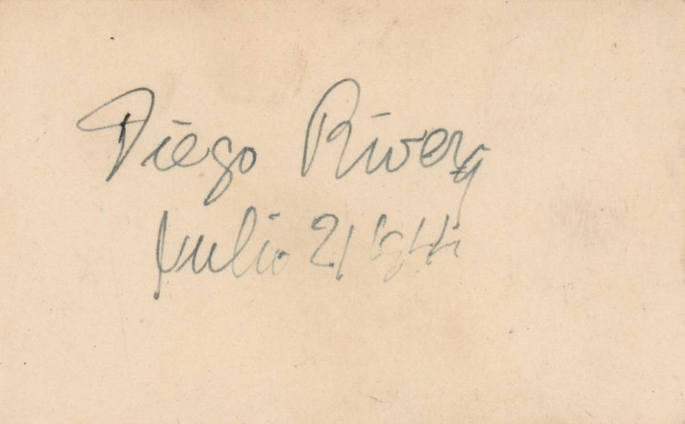 Vintage ink signature, "Diego Rivera, Julio 21, 1941,” on the reverse of an off-white 3.75 x 2.5 Mexican gallery card, imprinted: "Cadoro, G. Grether, Avenida Madero 56, Mexico D.F." In fine condition, with staining on the reverse.